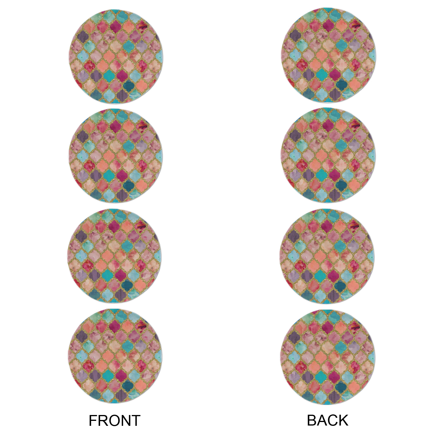 This design is simply the glitter moroccan pattern. The glitter outlining the pattern is a sparkling looking gold. The inside of the moroccan pattern is a watercolor texture with pinks, purples, teals, peaches, and blues. The coordinating design has a fun name and initial in the beautiful gold color.