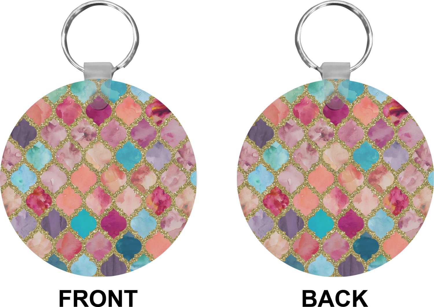 Our personalized keychains attach to the included metal, split key ring with a plastic, removable snap. Since a metal ring is included with your purchase, you have the liberty to keep your keys together on the ring, with or without your unique keychain. We offer this keychain in three different shapes: circle, heart, or diamond. We print your personalized design(s) on both sides of the key chain, and the surface has a glossy, reflective finish that only emphasizes your design. Each keychain is approximately 2.25 by 2.25 inches.