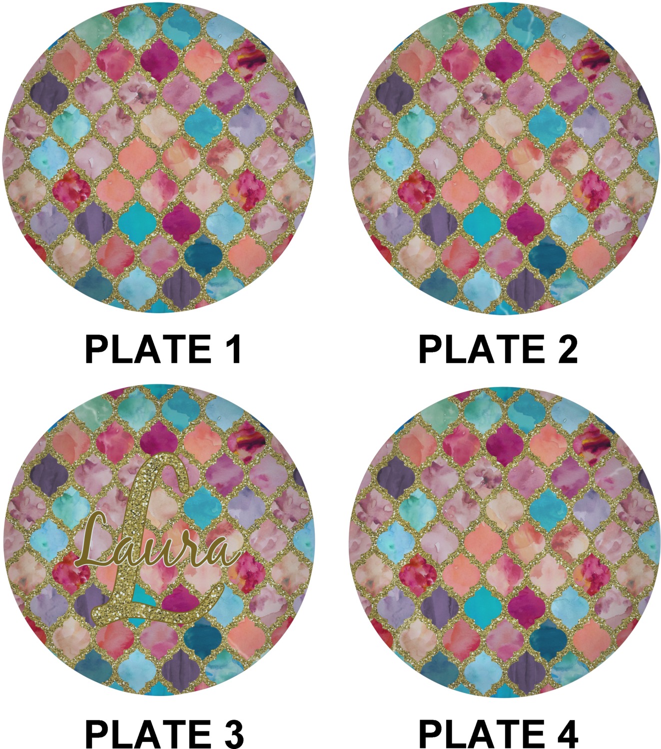 This design is simply the glitter moroccan pattern. The glitter outlining the pattern is a sparkling looking gold. The inside of the moroccan pattern is a watercolor texture with pinks, purples, teals, peaches, and blues. The coordinating design has a fun name and initial in the beautiful gold color.
