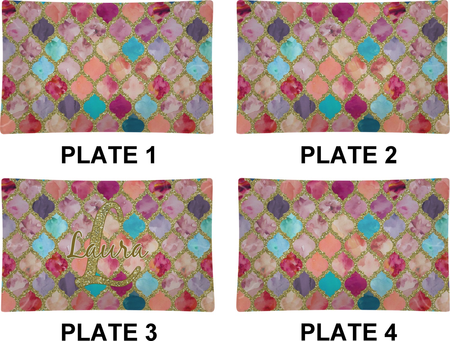 This design is simply the glitter moroccan pattern. The glitter outlining the pattern is a sparkling looking gold. The inside of the moroccan pattern is a watercolor texture with pinks, purples, teals, peaches, and blues. The coordinating design has a fun name and initial in the beautiful gold color.