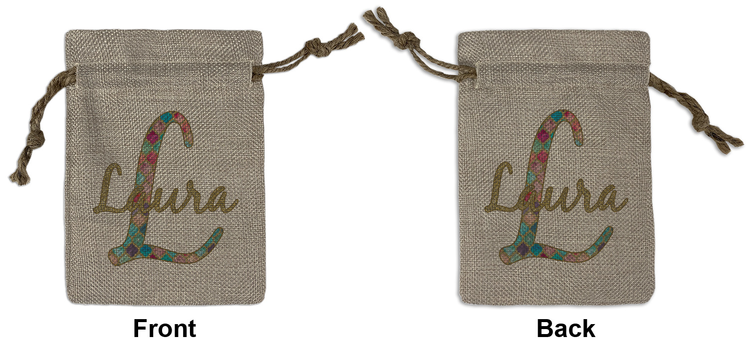 We sell our Burlap Gift Bags in 3 variant sized bags. Made with burlap polyester, each personalized bag can be secured with a twine drawstring pull. Your custom design is available to print on one side or both sides - completely up to you! The sizes of the bags measure approximately 4.5" x 6.5" for the smallest size, 6.5" x 8.0" for the medium size, and 6.5" x 13.5" for the large-sized bag.