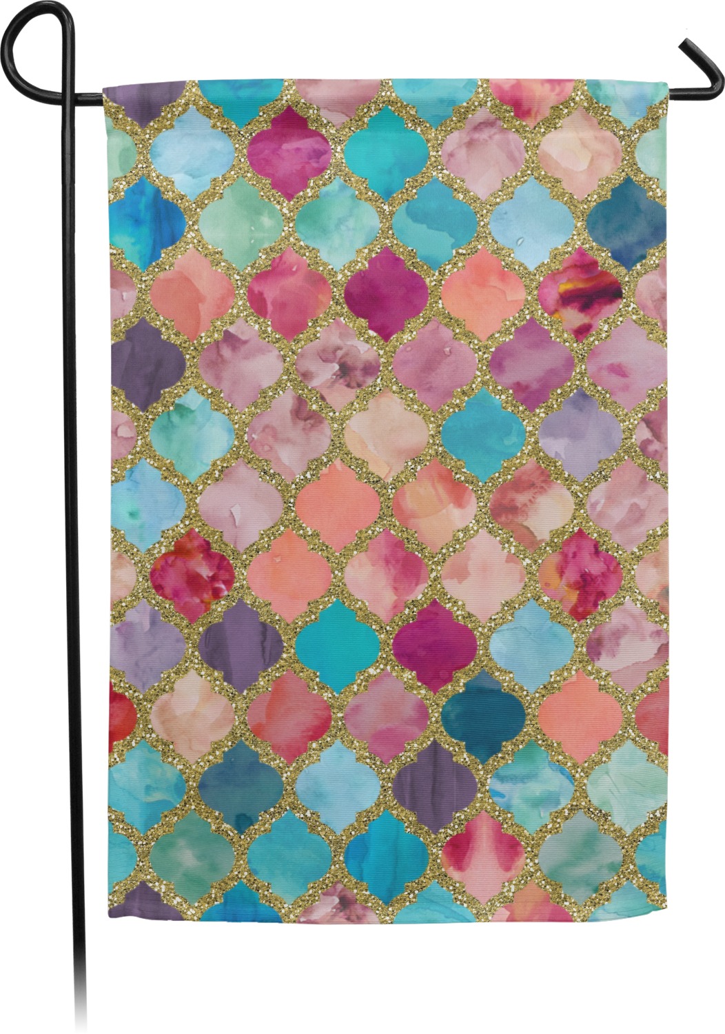 This design is simply the glitter moroccan pattern. The glitter outlining the pattern is a sparkling looking gold. The inside of the moroccan pattern is a watercolor texture with pinks, purples, teals, peaches, and blues. The coordinating design has a fun name and initial in the beautiful gold color.