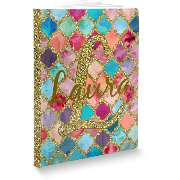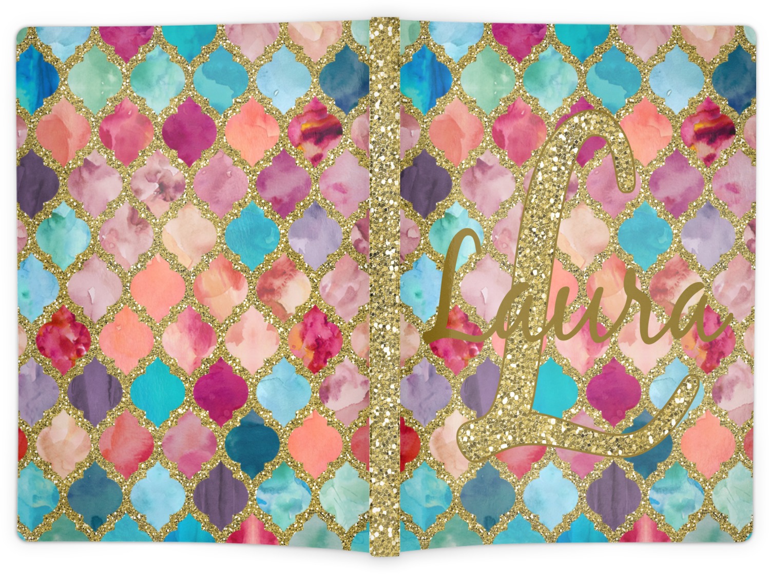 This design is simply the glitter moroccan pattern. The glitter outlining the pattern is a sparkling looking gold. The inside of the moroccan pattern is a watercolor texture with pinks, purples, teals, peaches, and blues. The coordinating design has a fun name and initial in the beautiful gold color.