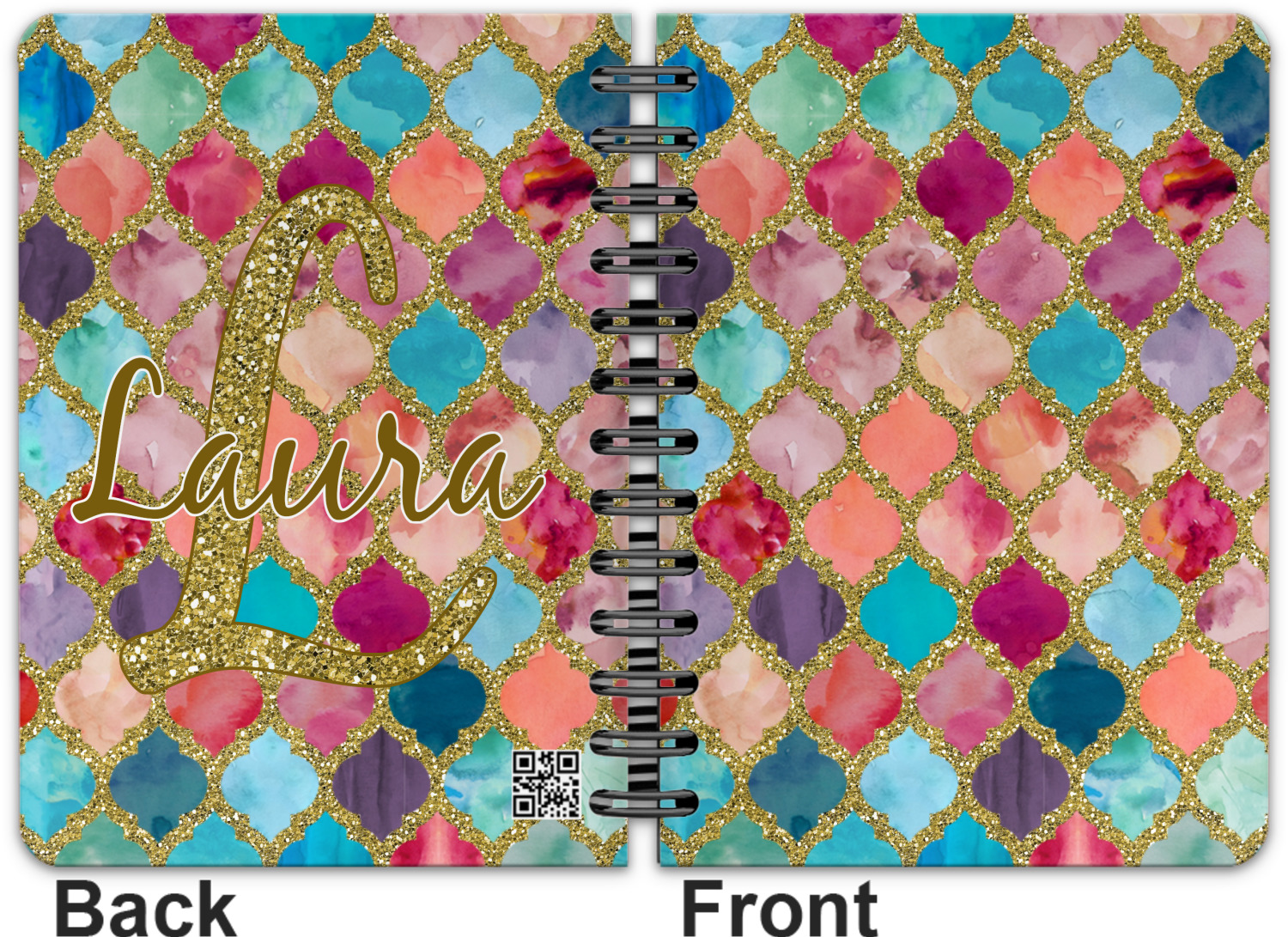 This spiral notebook includes 75 sheets of thick, ruled paper. The front and back of this custom notebook is made of a robust, laminate, plastic covering. We print your personalization on these two panels, underneath a glossy finish, which emphasizes the colors of your design. The two panels and the sheets of paper are held together by a sturdy, black coil. The paper within your bound notebook is perforated for easy, clean tearing.
