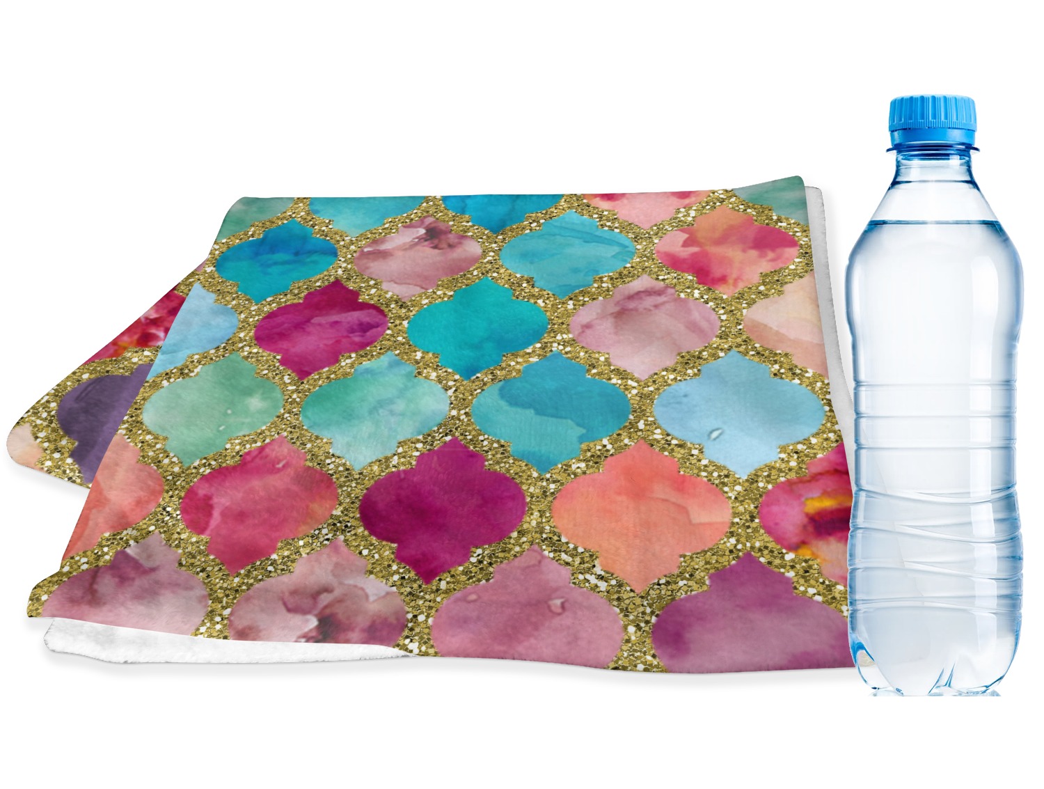 This design is simply the glitter moroccan pattern. The glitter outlining the pattern is a sparkling looking gold. The inside of the moroccan pattern is a watercolor texture with pinks, purples, teals, peaches, and blues. The coordinating design has a fun name and initial in the beautiful gold color.