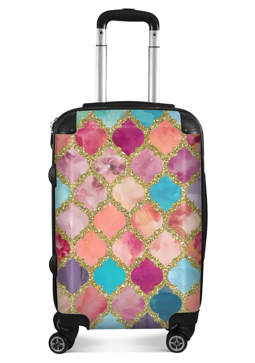 This design is simply the glitter moroccan pattern. The glitter outlining the pattern is a sparkling looking gold. The inside of the moroccan pattern is a watercolor texture with pinks, purples, teals, peaches, and blues. The coordinating design has a fun name and initial in the beautiful gold color.