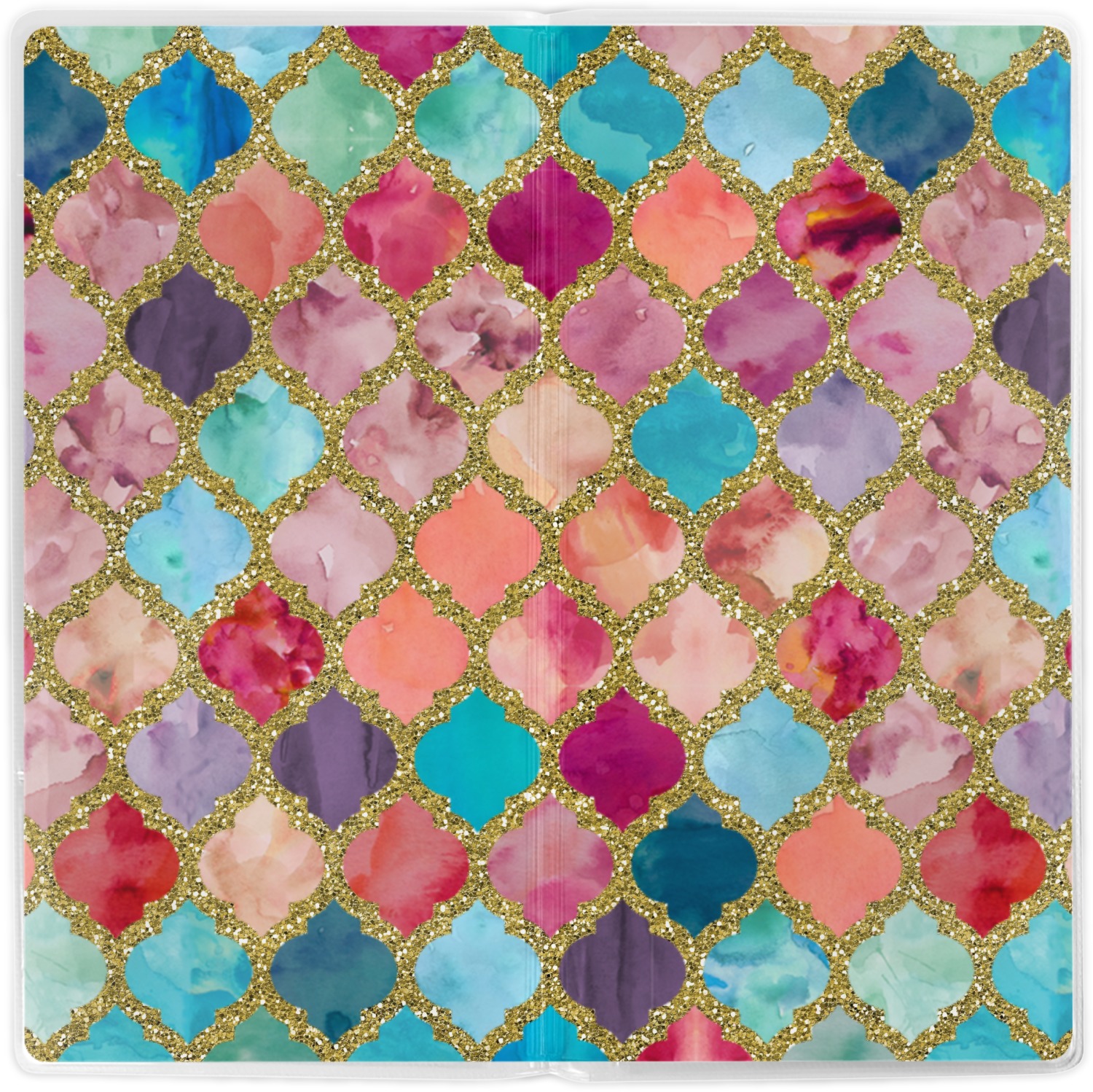 This design is simply the glitter moroccan pattern. The glitter outlining the pattern is a sparkling looking gold. The inside of the moroccan pattern is a watercolor texture with pinks, purples, teals, peaches, and blues. The coordinating design has a fun name and initial in the beautiful gold color.