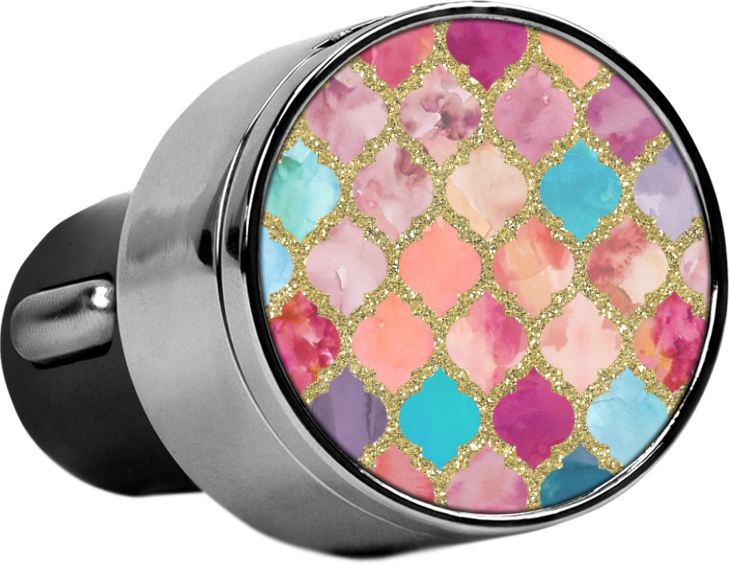 This car charger adapter converts your cars bland cigarette lighter into a decorative, personalized, and operational USB charging port. Made of solid, silver-plated metal, these chargers feature a flip-open lid that both displays your customized design and conceals two USB ports. The metal lid of the USB car charger adapter is 1.5" in diameter and seals due to a small, ingrained magnet on both the charger and its lid. The cigarette lighter insert, itself, is colored black.
