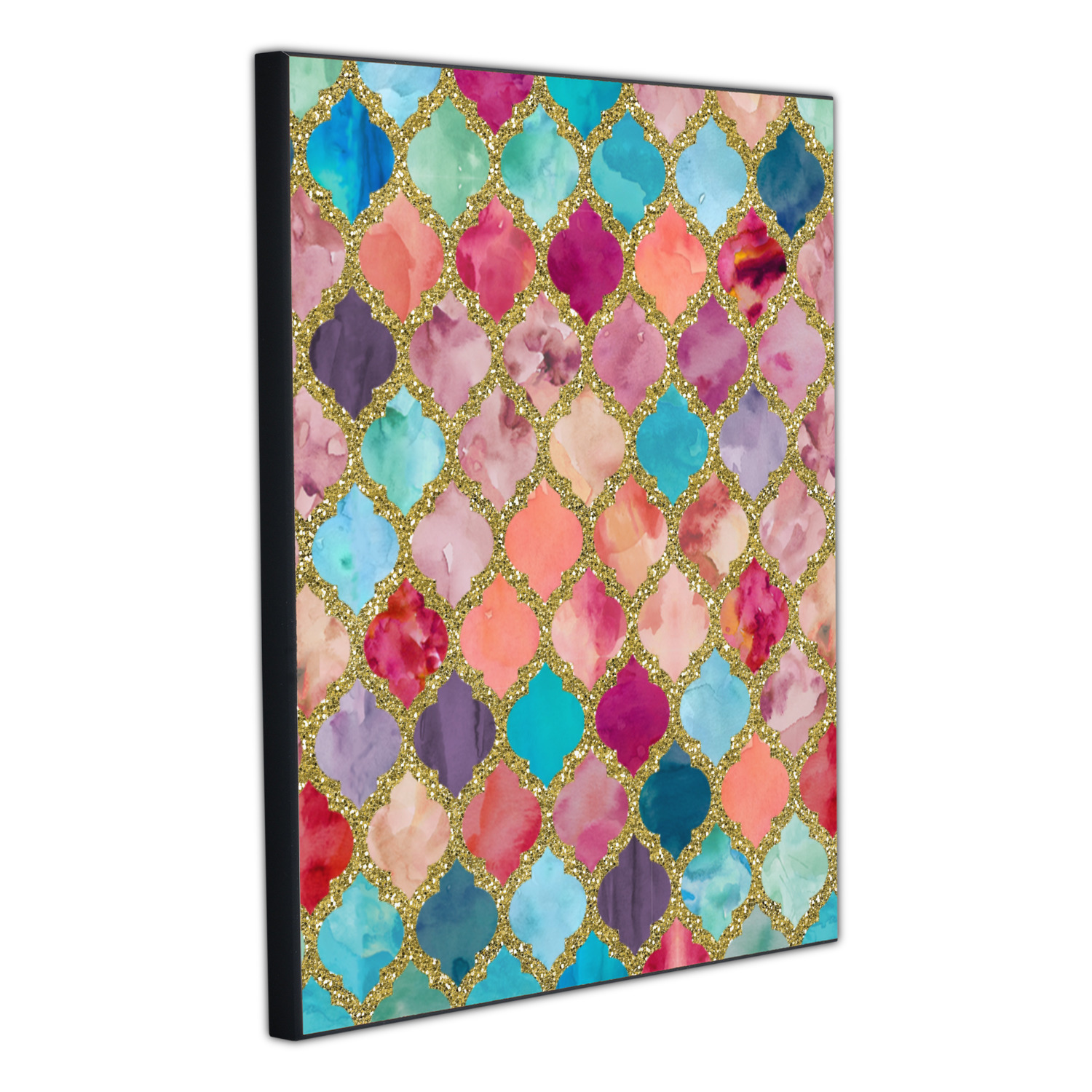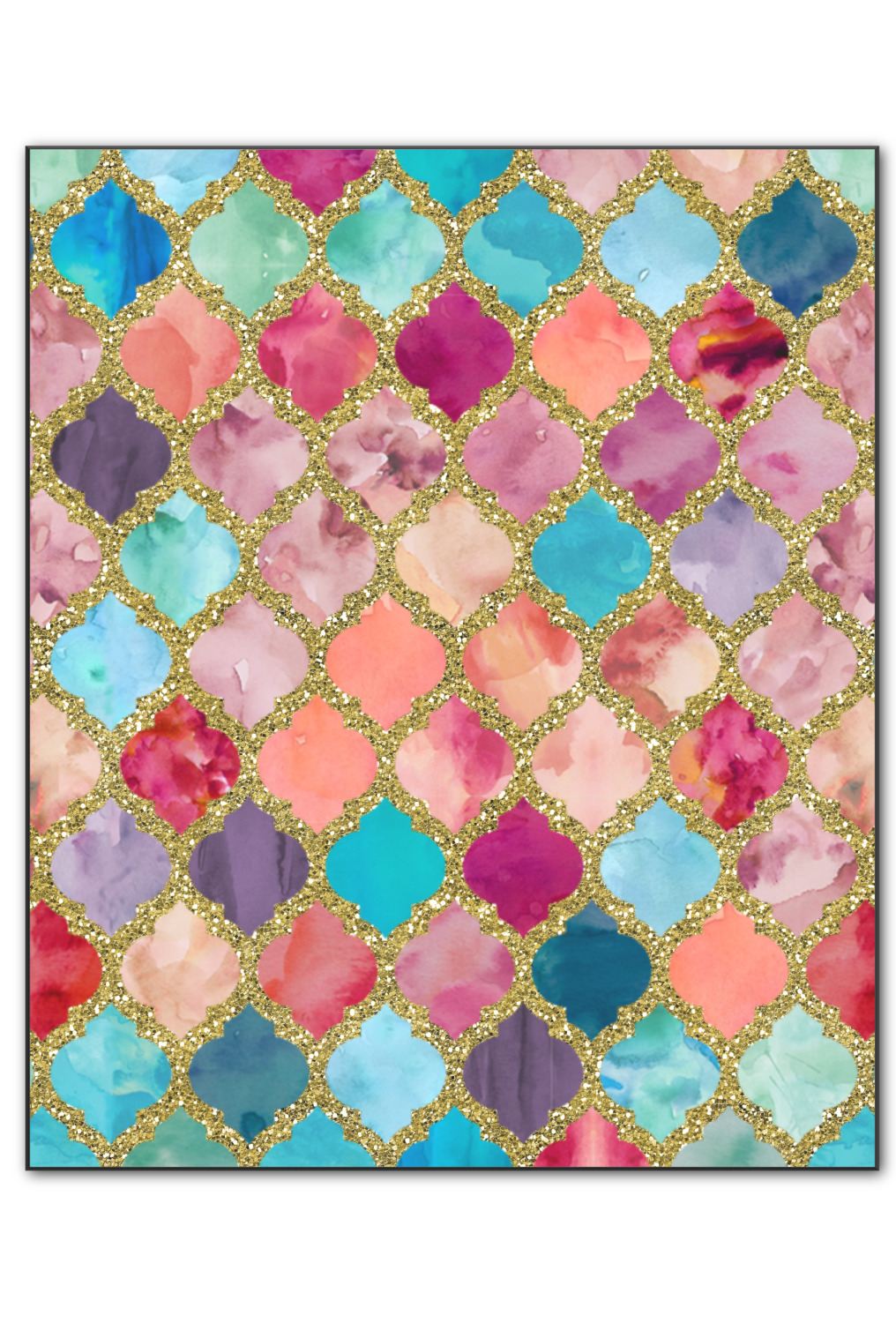 This design is simply the glitter moroccan pattern. The glitter outlining the pattern is a sparkling looking gold. The inside of the moroccan pattern is a watercolor texture with pinks, purples, teals, peaches, and blues. The coordinating design has a fun name and initial in the beautiful gold color.