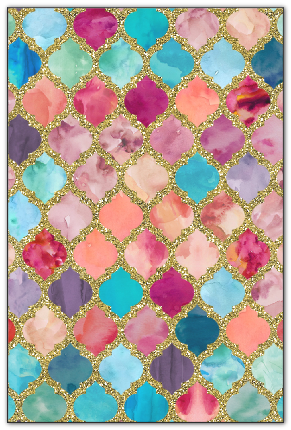 This design is simply the glitter moroccan pattern. The glitter outlining the pattern is a sparkling looking gold. The inside of the moroccan pattern is a watercolor texture with pinks, purples, teals, peaches, and blues. The coordinating design has a fun name and initial in the beautiful gold color.