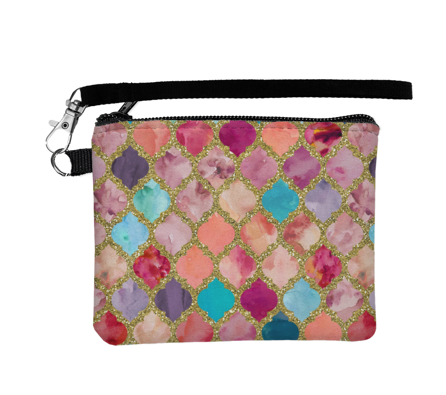 This design is simply the glitter moroccan pattern. The glitter outlining the pattern is a sparkling looking gold. The inside of the moroccan pattern is a watercolor texture with pinks, purples, teals, peaches, and blues. The coordinating design has a fun name and initial in the beautiful gold color.