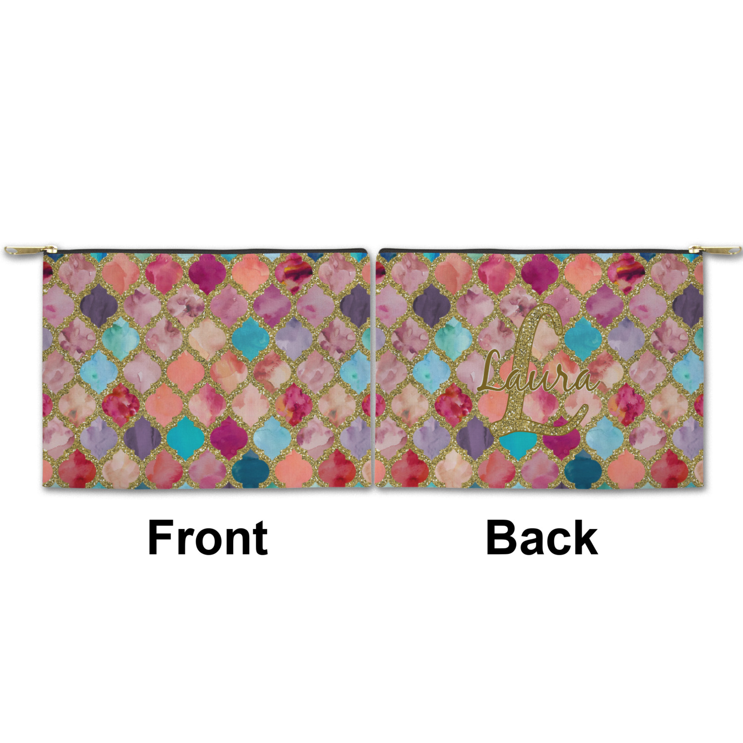 You can design both the front and the back of the pouch - same design, two complementary designs or two totally different designs - the choice is yours! We offer many different personalization styles i.e. name, name & initial, monograms - so the choice to personalize is also yours.