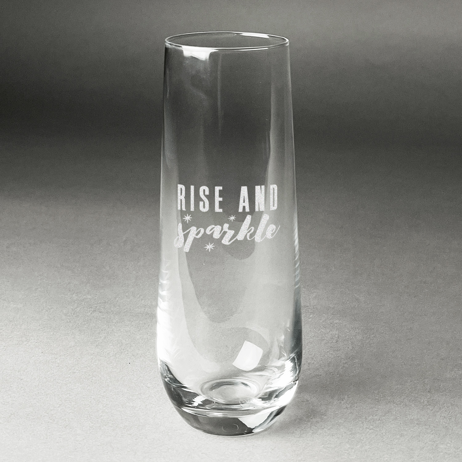 Design your custom stemless champagne flutes and we will then laser engrave your unique design on them for you. Whether they are a special gift for a bride and groom, for your New Years Eve party, or a bachelorette party you are sure to be able to add a custom personalized touch to make them perfect for the occasion.