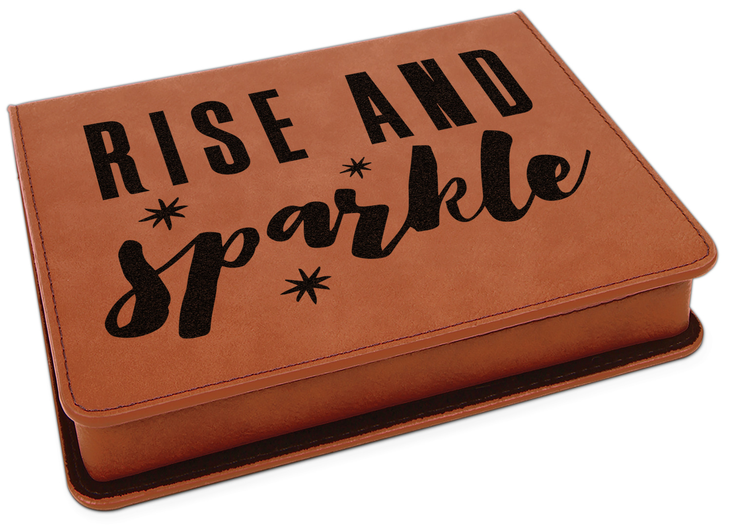 This set includes a wine stopper, pourer, drip ring, and a corkscrew! The exterior of the box is a gorgeous, cognac-brown leatherette, while the interior is covered in a black, velvety material. Four foam indentations, unique to the shape of the wine tool, are found at the bottom half of the box's interior. The tools fit snugly into each of their designated spots, and the foam material helps to protect the integrity of your tools. Each of the wine gadgets features a bamboo accent, with the location and style depending on the tool itself. We laser engrave your personalized design onto the lid of the box, which easily flips open and is secured closed by a small magnet. The wine accessories box measures at 7 by 5.5 inches in total.