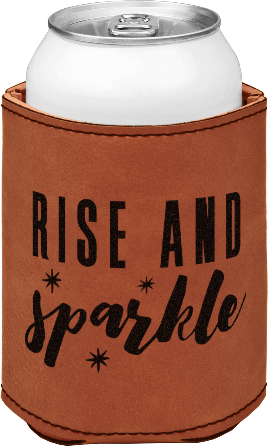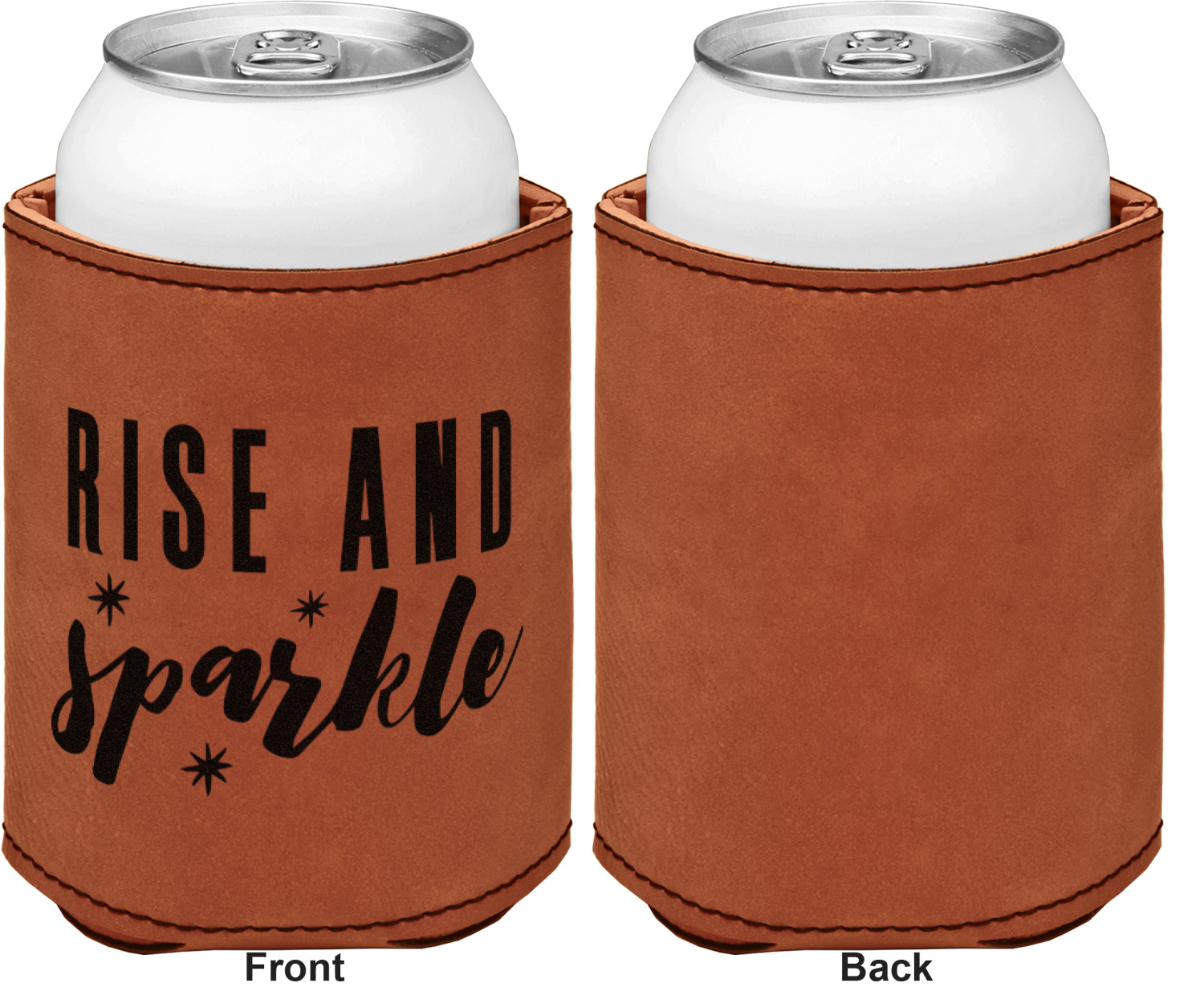 This can sleeve is made from a cognac-brown leatherette and stitched with a sturdy, black thread. A slim padding lines the inside of your can sleeve to allow for a better fit once your drink is inserted. The sleeve itself measures at 4 by 4.5 inches, allowing this custom can sleeve to accommodate most canned drinks. Your personalized design can be engraved on the front and back, or solely the front. When laser-engraved, your design appears as a black coloration which contrasts the leatherette nicely.