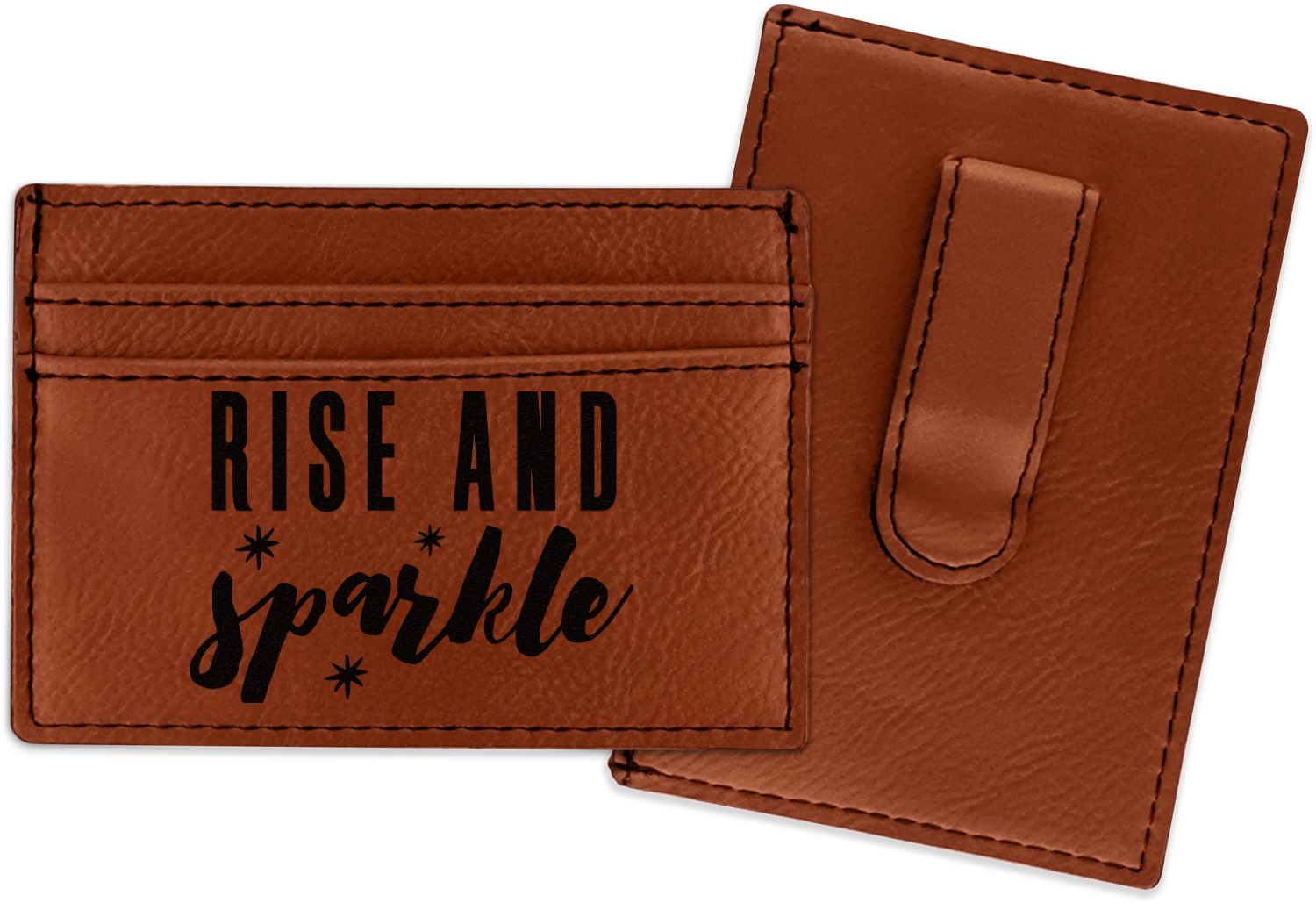 Made from a smooth brown leatherette material, these money clip wallets are the perfect accessory. They measure at approximately 4" x 2.75". On one side there is a money clip where you can slip in your cash. On the other side are three card slots for an ID and credit card or two. The money clip wallet will be laser engraved with your design on the side with the credit card slots. The graphic will come out as a black color.