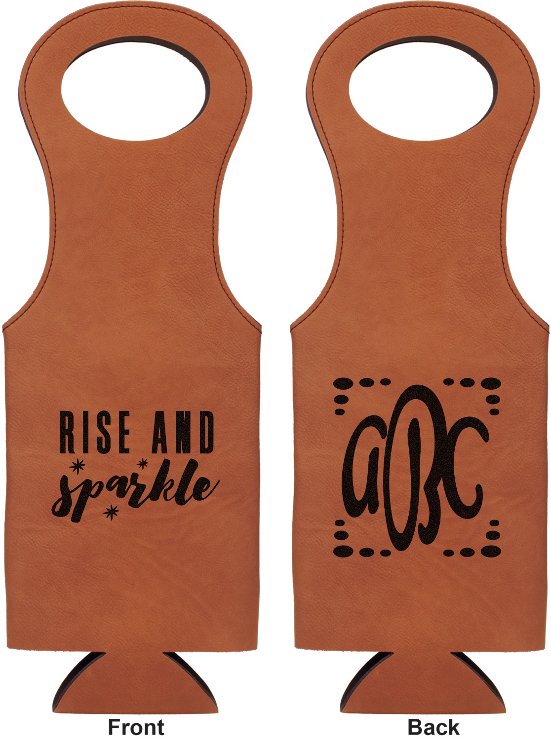 This wine carrier is made from a stunning leatherette, in a cognac-brown color. Strong, black stitching lines the sides of your wine bottle bag and provides extra durability. The interior is lined with a padded, black material to allow for a snug fit once your bottle is placed inside. At the top of this wine gift bag, you'll find two oval shaped handles that elegantly complements the rest of the bag's style. We provide you with the option of laser-engraving the front, or the front and back of your new personalized wine bag!