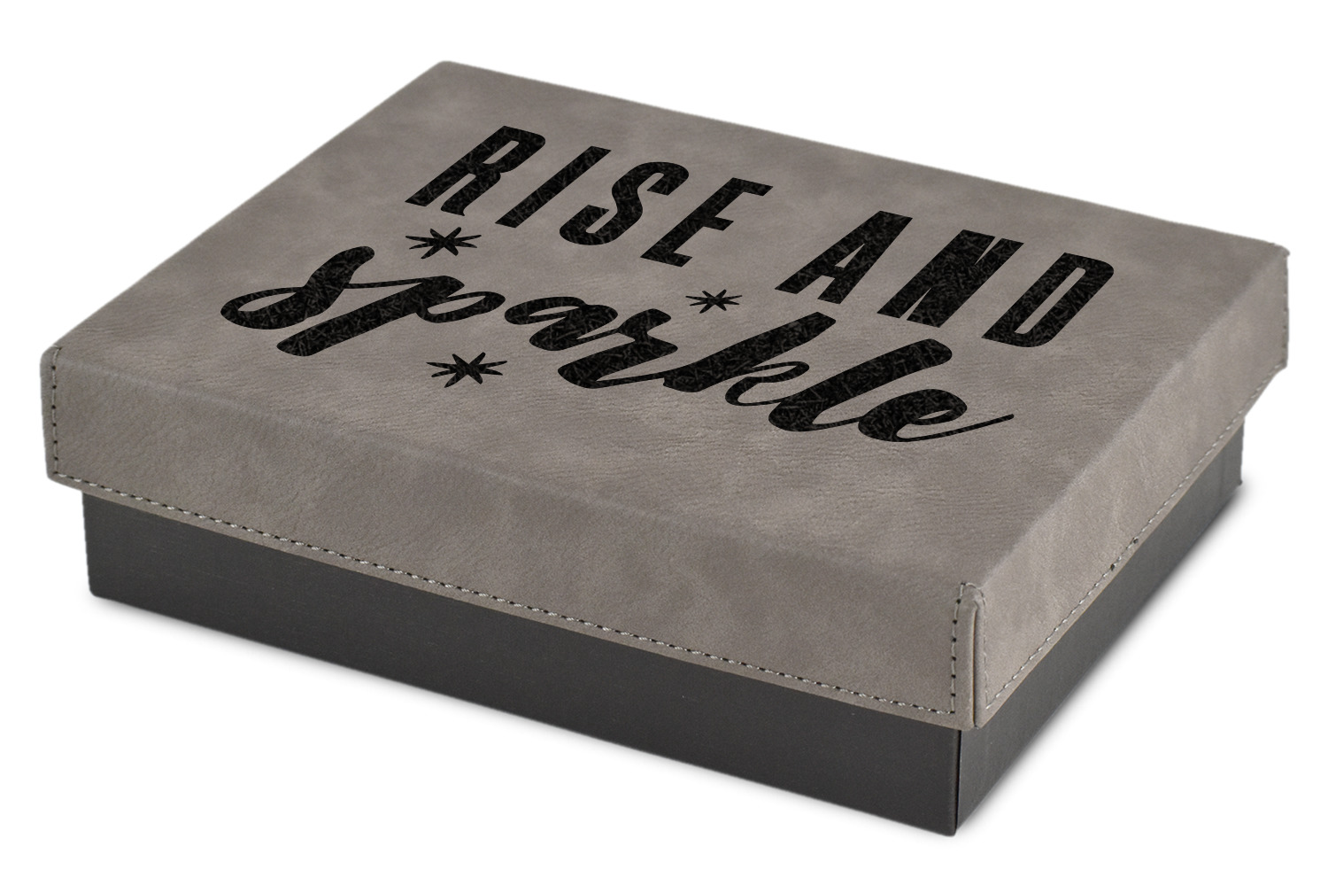 These gift boxes are available in 3 different sizes to accommodate various sized gifts. Available in gray as a neutral color for any occasion as well as to showcase your design boldly. Engraved with a laser this high quality paper board and faux leather gift box is unique and makes any gift stand out.