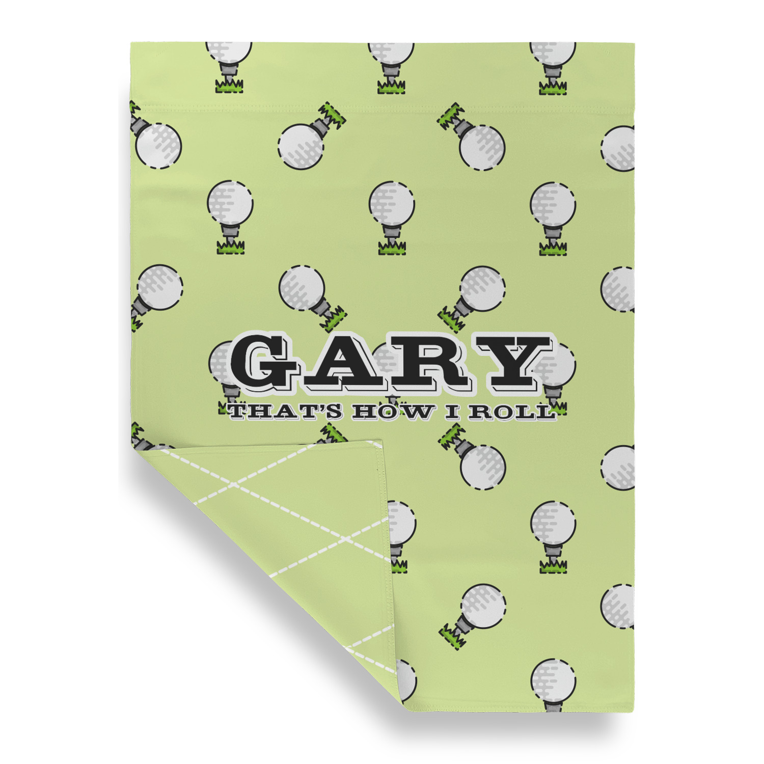 This design has a fun background that has illustrations of golf balls on a tee symmetrically placed to make a fun pattern. The main colors are a light lime green with a little dark green and white. The text is easily changed to whatever you like. The default has a place for a name as well as the phrase "that's how I roll" to get a good laugh out of your buddies. This is a fun design to use on your golfing gear.