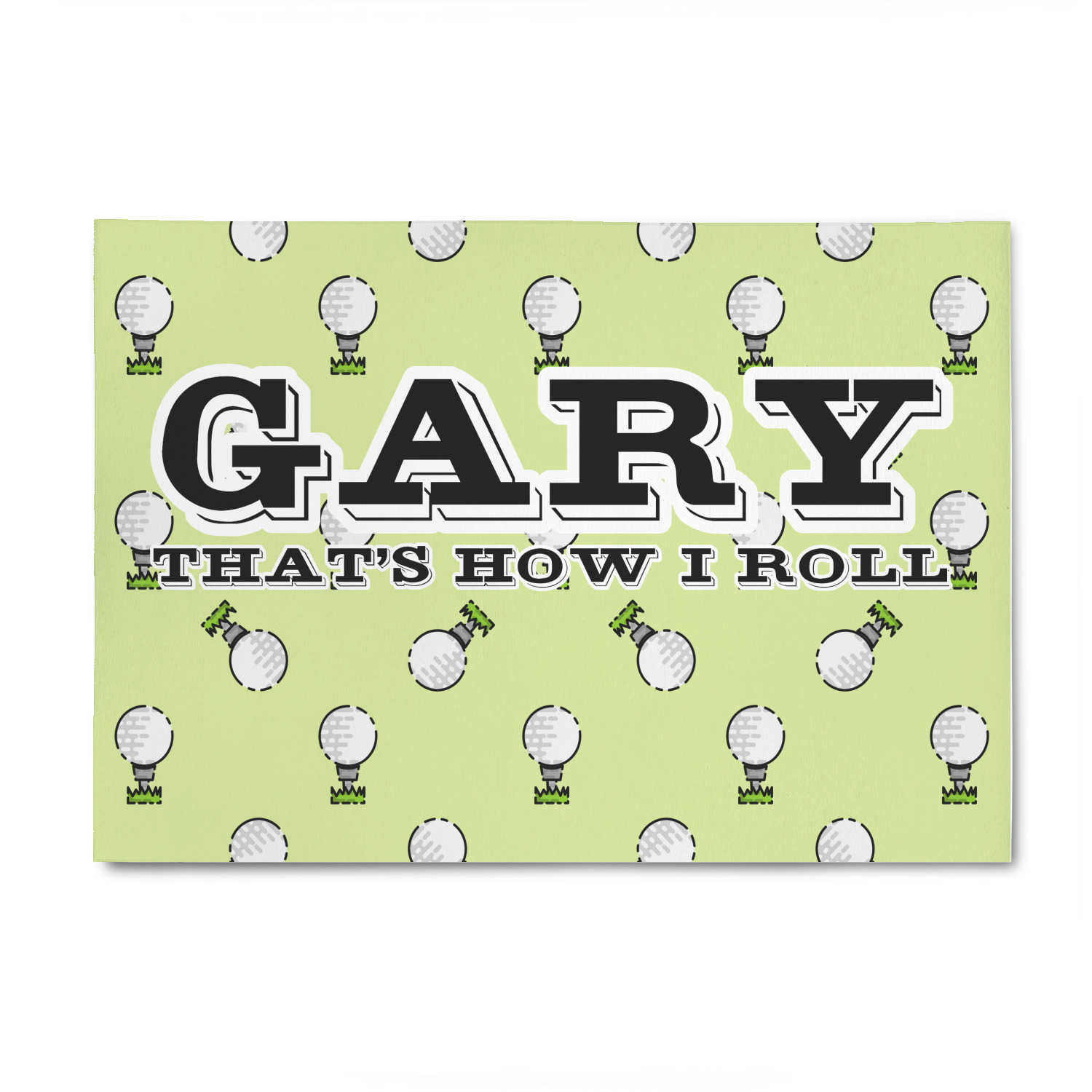 This design has a fun background that has illustrations of golf balls on a tee symmetrically placed to make a fun pattern. The main colors are a light lime green with a little dark green and white. The text is easily changed to whatever you like. The default has a place for a name as well as the phrase "that's how I roll" to get a good laugh out of your buddies. This is a fun design to use on your golfing gear.