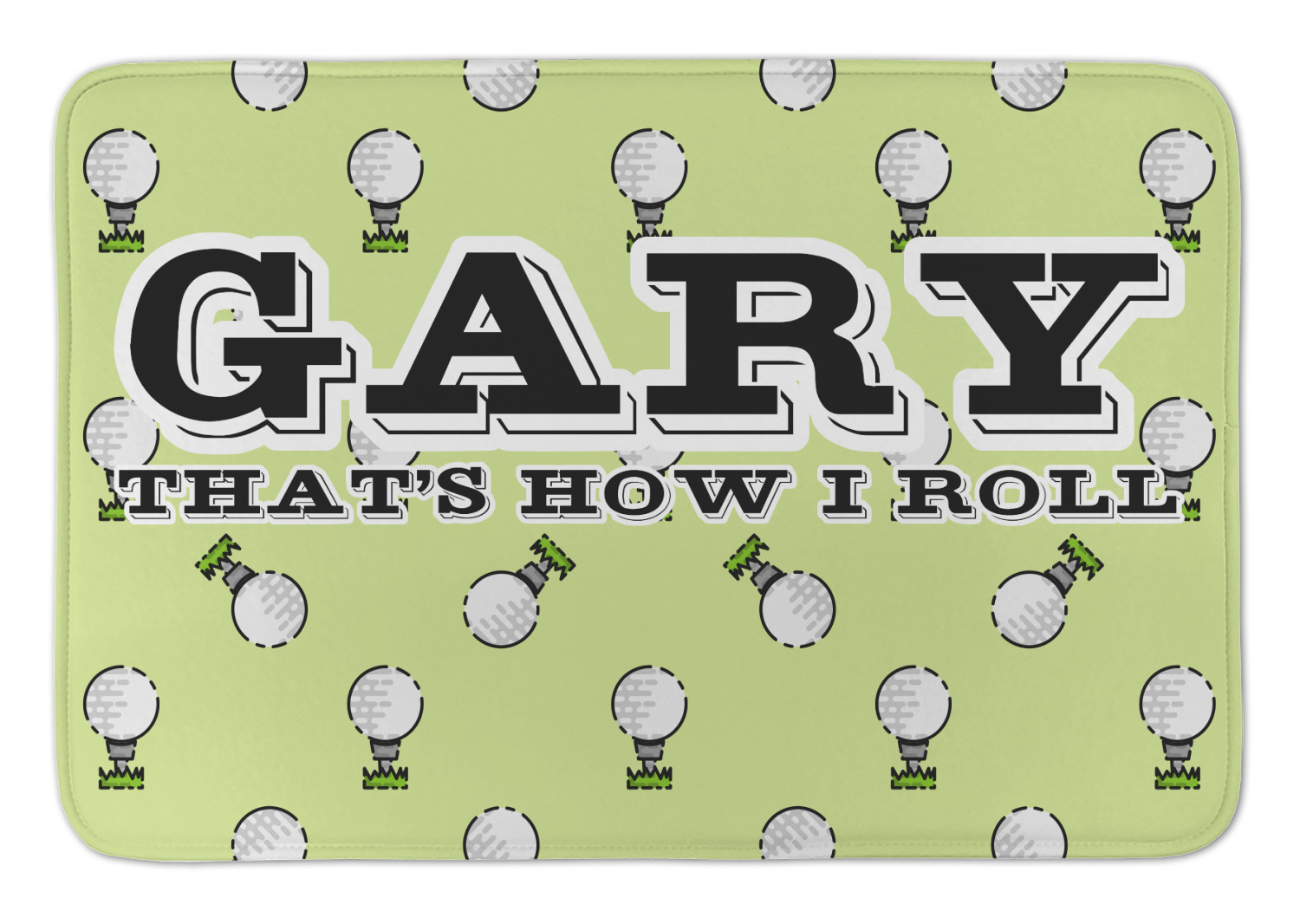 This design has a fun background that has illustrations of golf balls on a tee symmetrically placed to make a fun pattern. The main colors are a light lime green with a little dark green and white. The text is easily changed to whatever you like. The default has a place for a name as well as the phrase "that's how I roll" to get a good laugh out of your buddies. This is a fun design to use on your golfing gear.