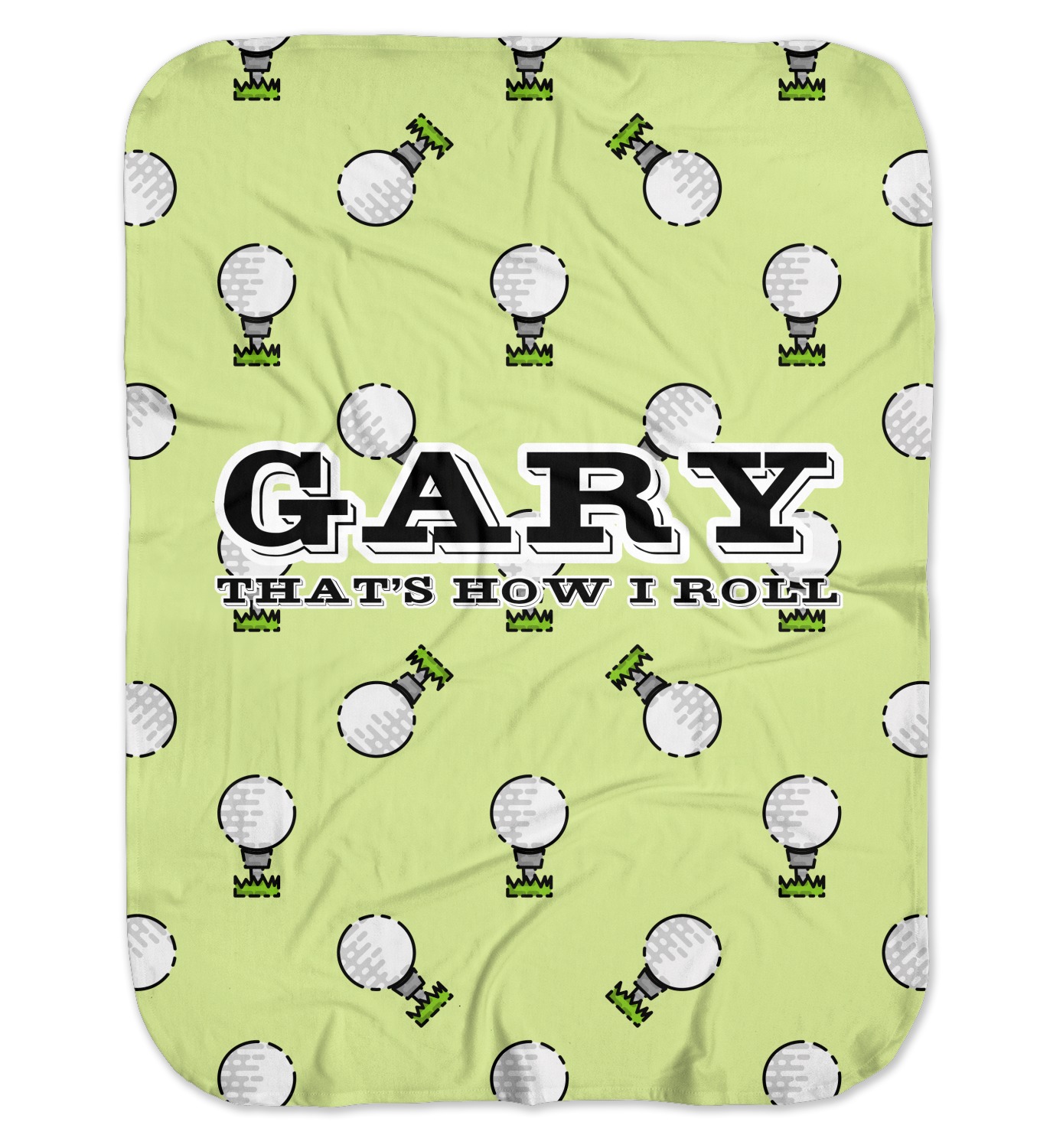 This design has a fun background that has illustrations of golf balls on a tee symmetrically placed to make a fun pattern. The main colors are a light lime green with a little dark green and white. The text is easily changed to whatever you like. The default has a place for a name as well as the phrase "that's how I roll" to get a good laugh out of your buddies. This is a fun design to use on your golfing gear.