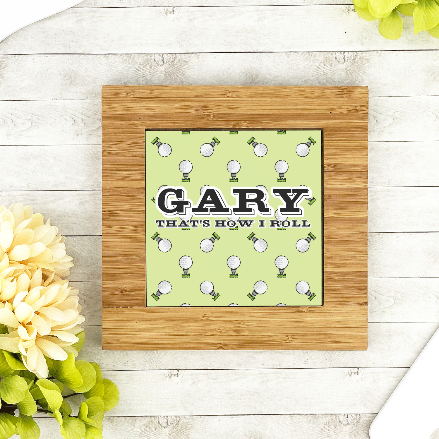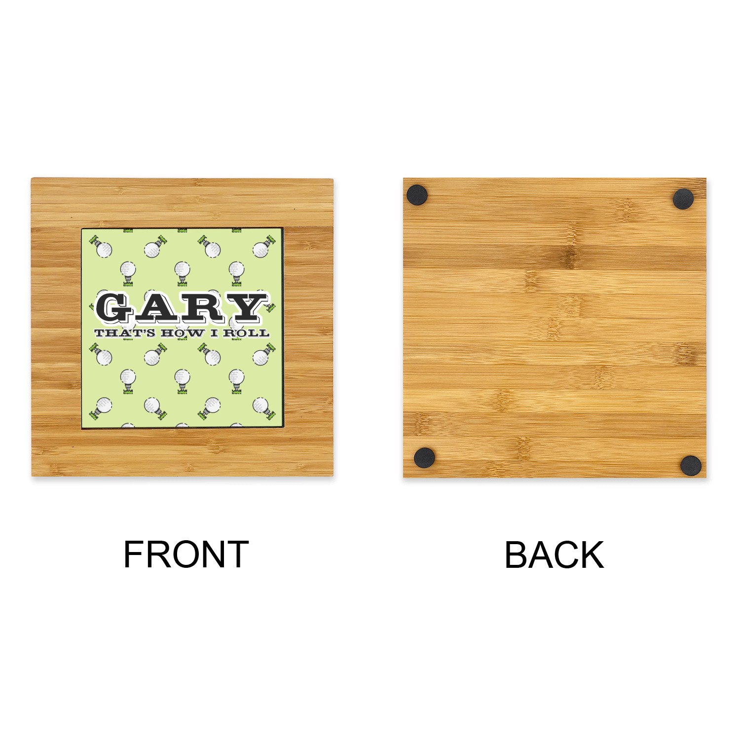 This design has a fun background that has illustrations of golf balls on a tee symmetrically placed to make a fun pattern. The main colors are a light lime green with a little dark green and white. The text is easily changed to whatever you like. The default has a place for a name as well as the phrase "that's how I roll" to get a good laugh out of your buddies. This is a fun design to use on your golfing gear.