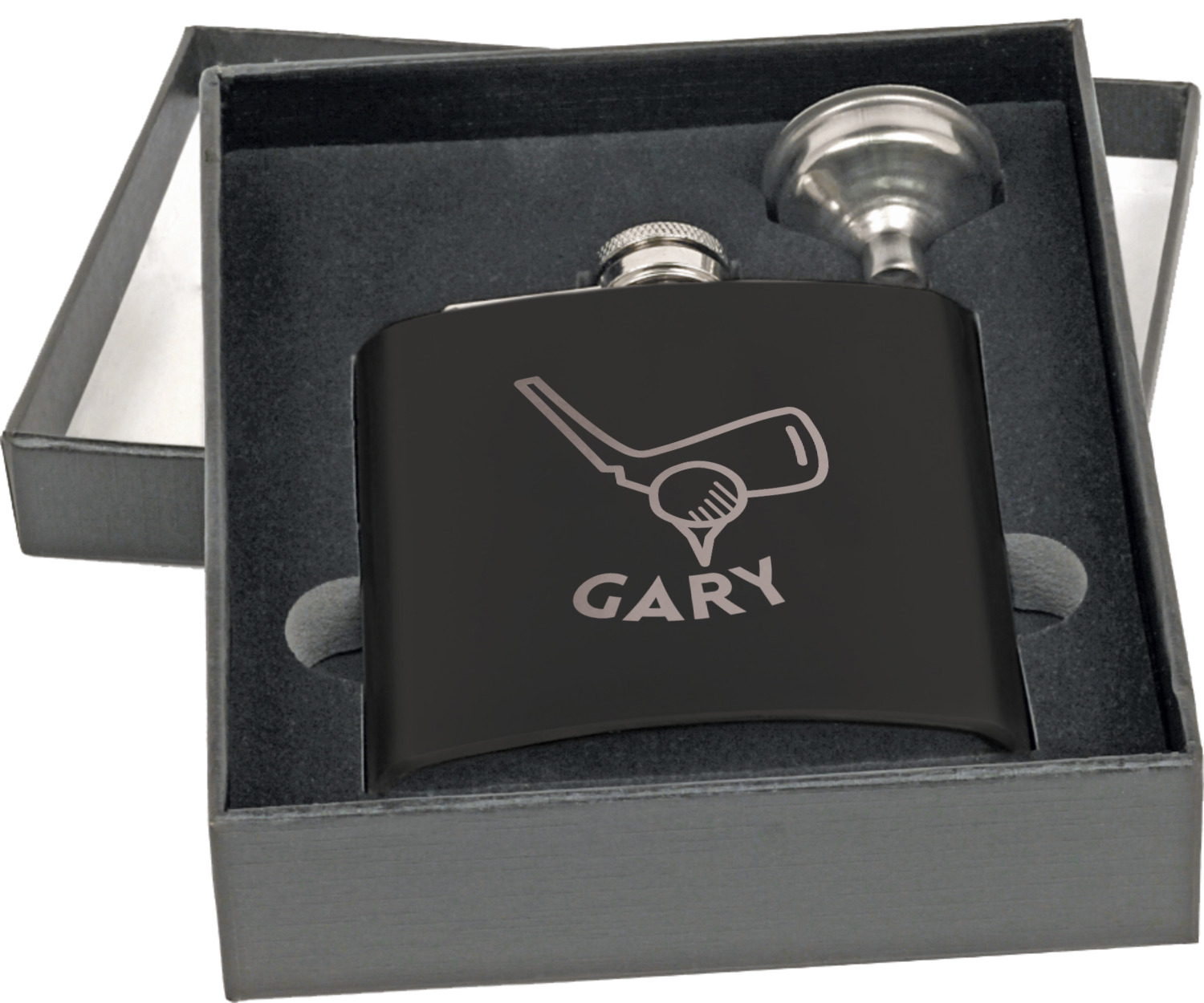 Built from a stainless steel and then covered with a black coating, this hip flask, has a very classy appearance. Similar to the standard flask, this stainless steel flask has the traditional curved shape for a snug fit in your palm. This flask set also includes a traditional screw and flip lid and liquid funnel in a gift box. At 4 by 4.5 inches, this flask can hold up to 6 ounces. Your personalized design is laser-engraved across the front of this flask.