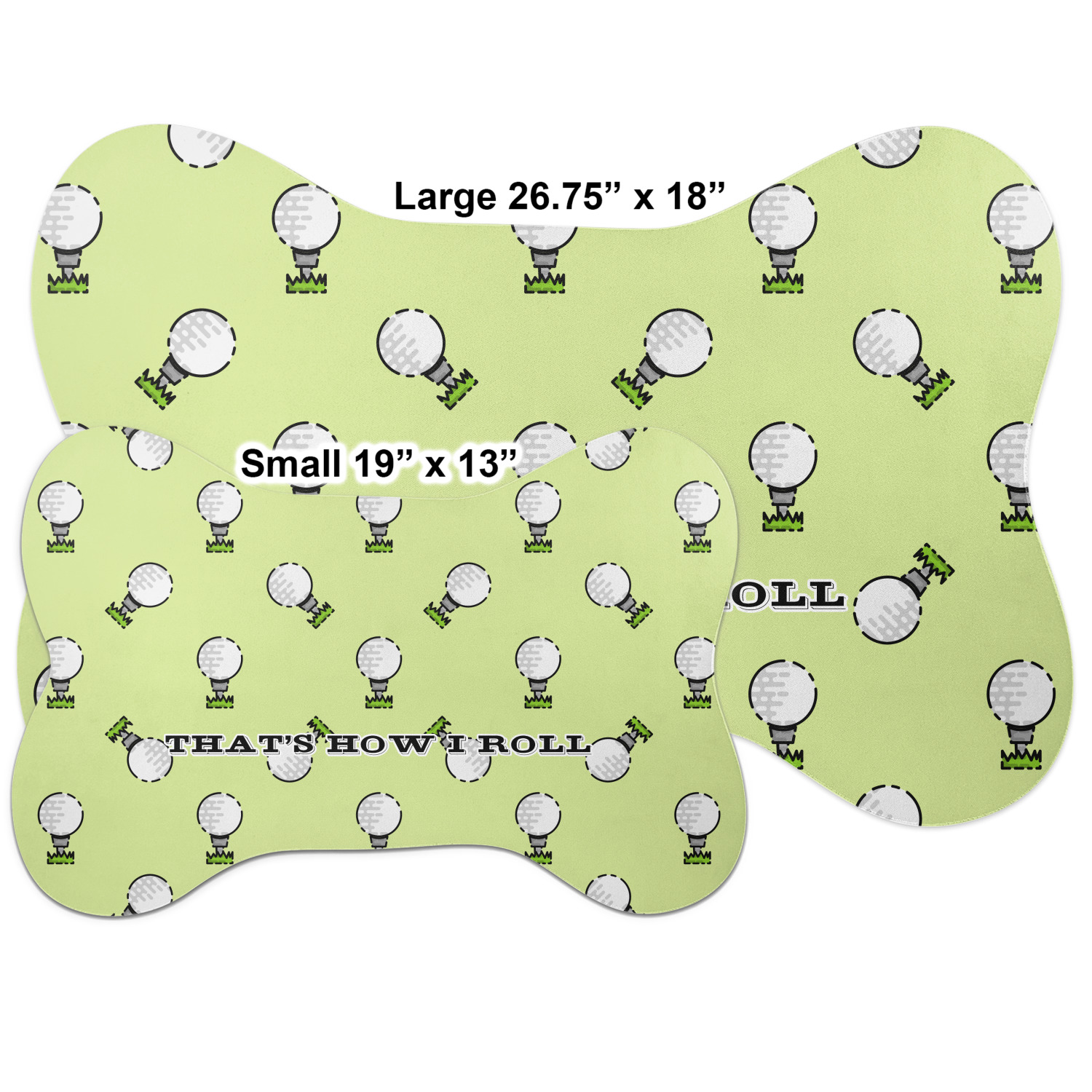 The top of this mat displays your custom design, as it is printed on polyester. To prevent slippage, the underside of the mat is made of rubber. We offer a small dog food mat, suitable for smaller dogs and a large dog food mat for bigger breeds. The small dog food mat is approximately 19 by 13 inches, while the large dog feeding mat measures at approximately 26.75 by 18 inches. Both personalized mats are ideally sized to fit two dog bowls.