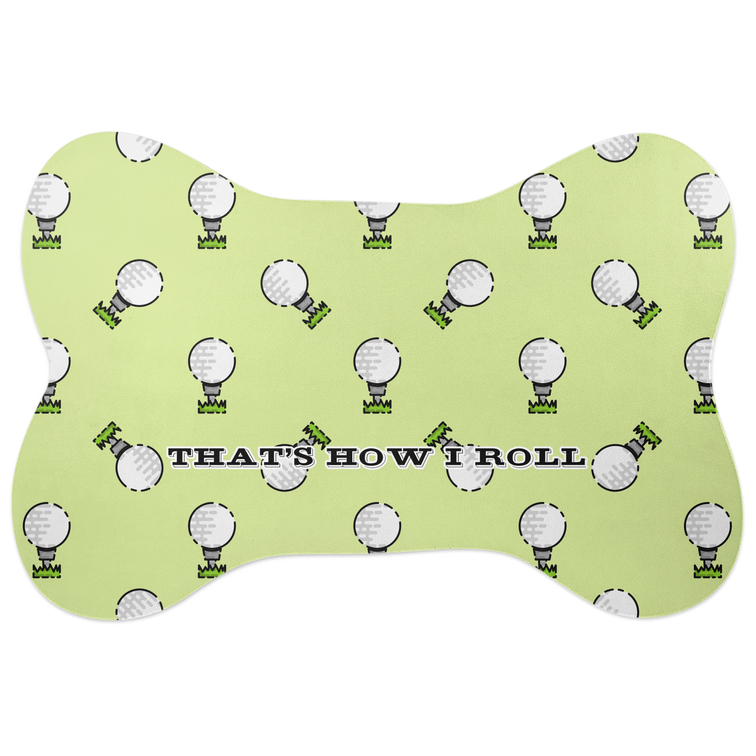 This design has a fun background that has illustrations of golf balls on a tee symmetrically placed to make a fun pattern. The main colors are a light lime green with a little dark green and white. The text is easily changed to whatever you like. The default has a place for a name as well as the phrase "that's how I roll" to get a good laugh out of your buddies. This is a fun design to use on your golfing gear.