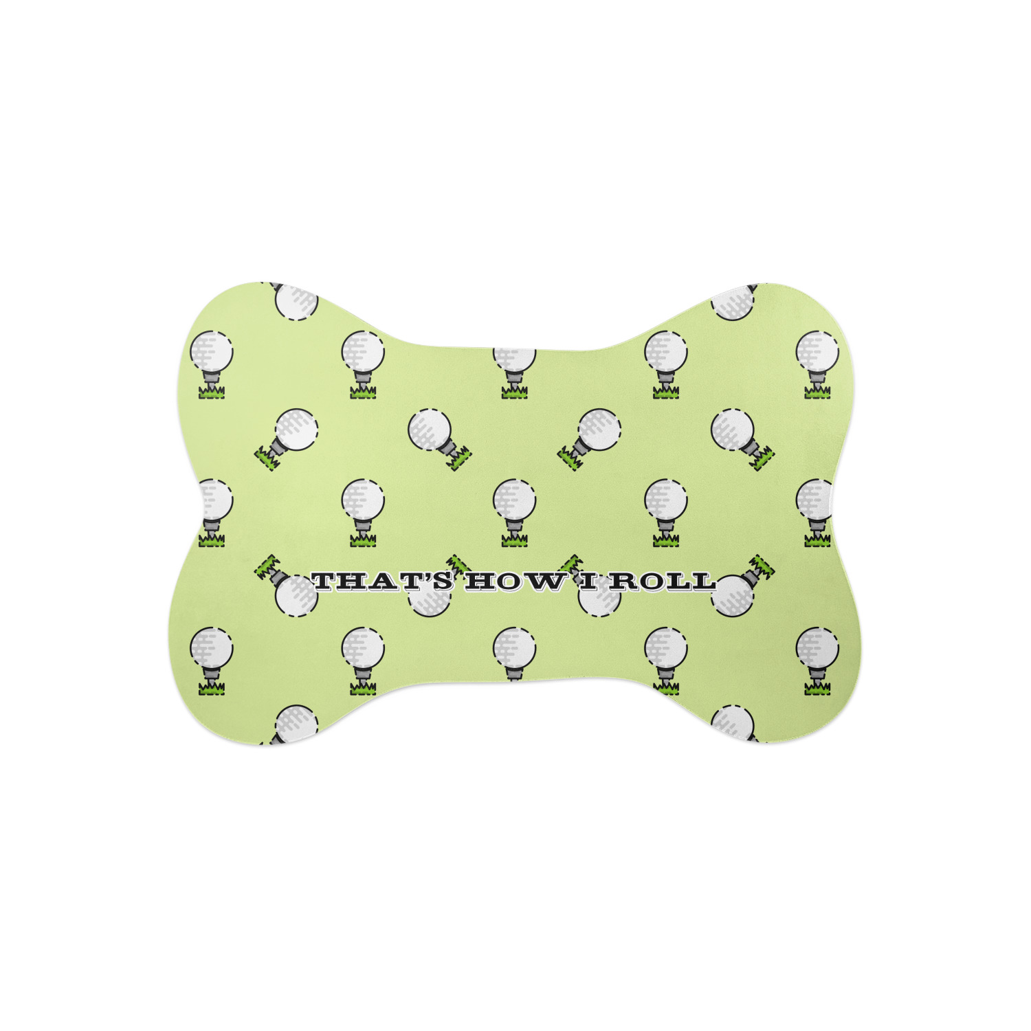 This design has a fun background that has illustrations of golf balls on a tee symmetrically placed to make a fun pattern. The main colors are a light lime green with a little dark green and white. The text is easily changed to whatever you like. The default has a place for a name as well as the phrase "that's how I roll" to get a good laugh out of your buddies. This is a fun design to use on your golfing gear.