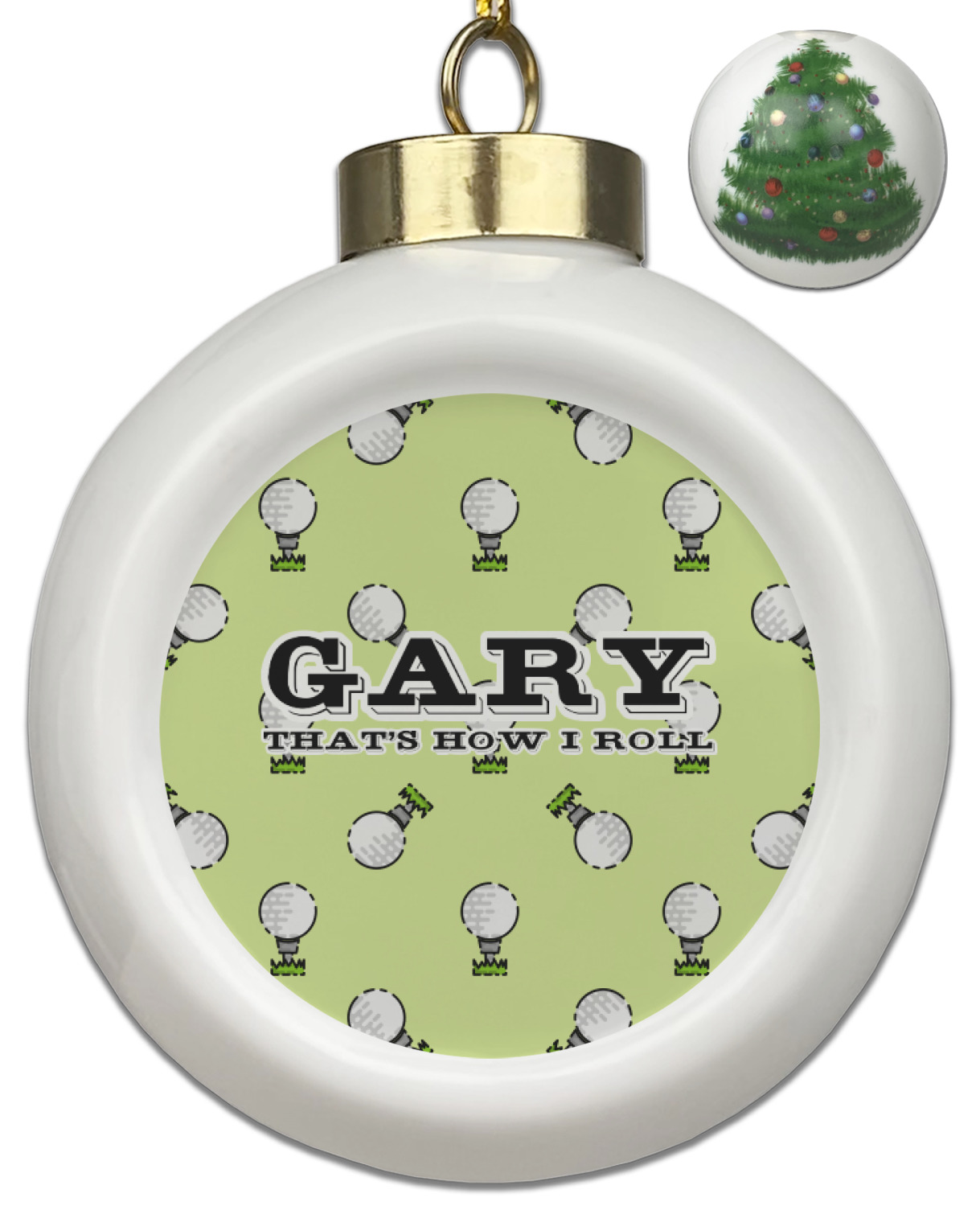 This design has a fun background that has illustrations of golf balls on a tee symmetrically placed to make a fun pattern. The main colors are a light lime green with a little dark green and white. The text is easily changed to whatever you like. The default has a place for a name as well as the phrase "that's how I roll" to get a good laugh out of your buddies. This is a fun design to use on your golfing gear.