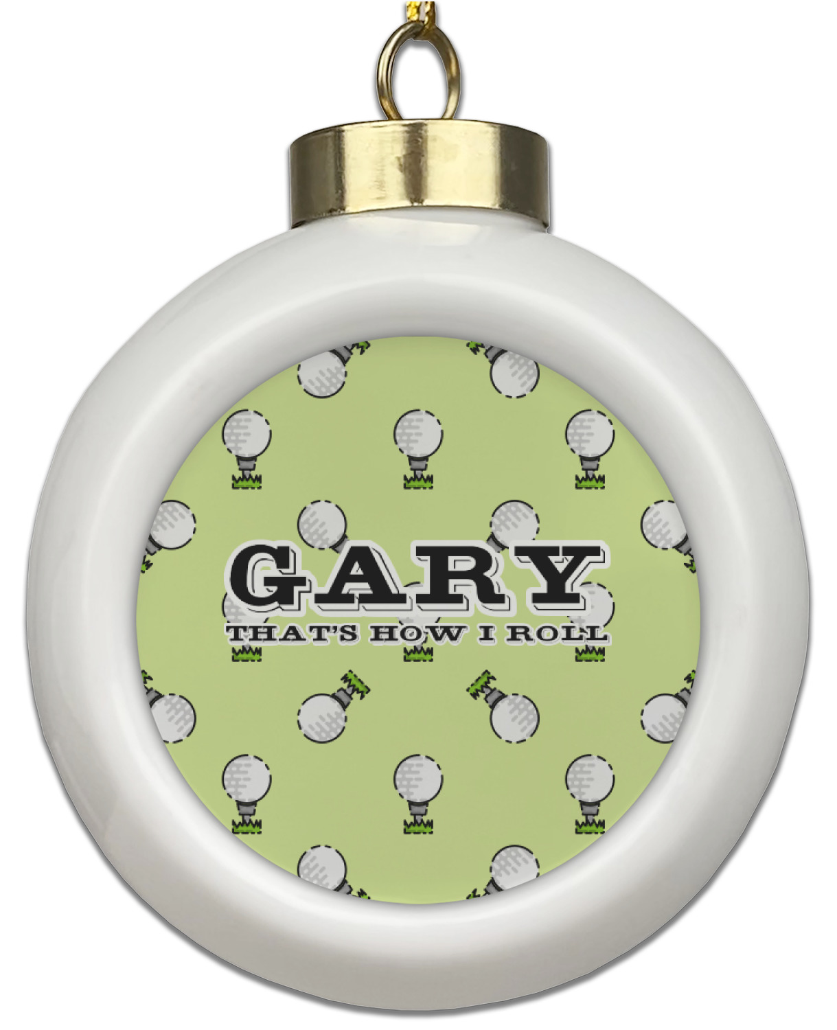 This design has a fun background that has illustrations of golf balls on a tee symmetrically placed to make a fun pattern. The main colors are a light lime green with a little dark green and white. The text is easily changed to whatever you like. The default has a place for a name as well as the phrase "that's how I roll" to get a good laugh out of your buddies. This is a fun design to use on your golfing gear.