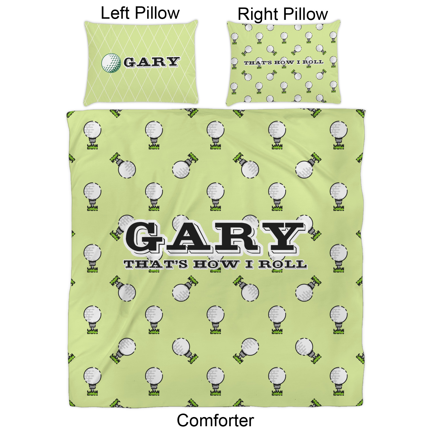 This design has a fun background that has illustrations of golf balls on a tee symmetrically placed to make a fun pattern. The main colors are a light lime green with a little dark green and white. The text is easily changed to whatever you like. The default has a place for a name as well as the phrase "that's how I roll" to get a good laugh out of your buddies. This is a fun design to use on your golfing gear.