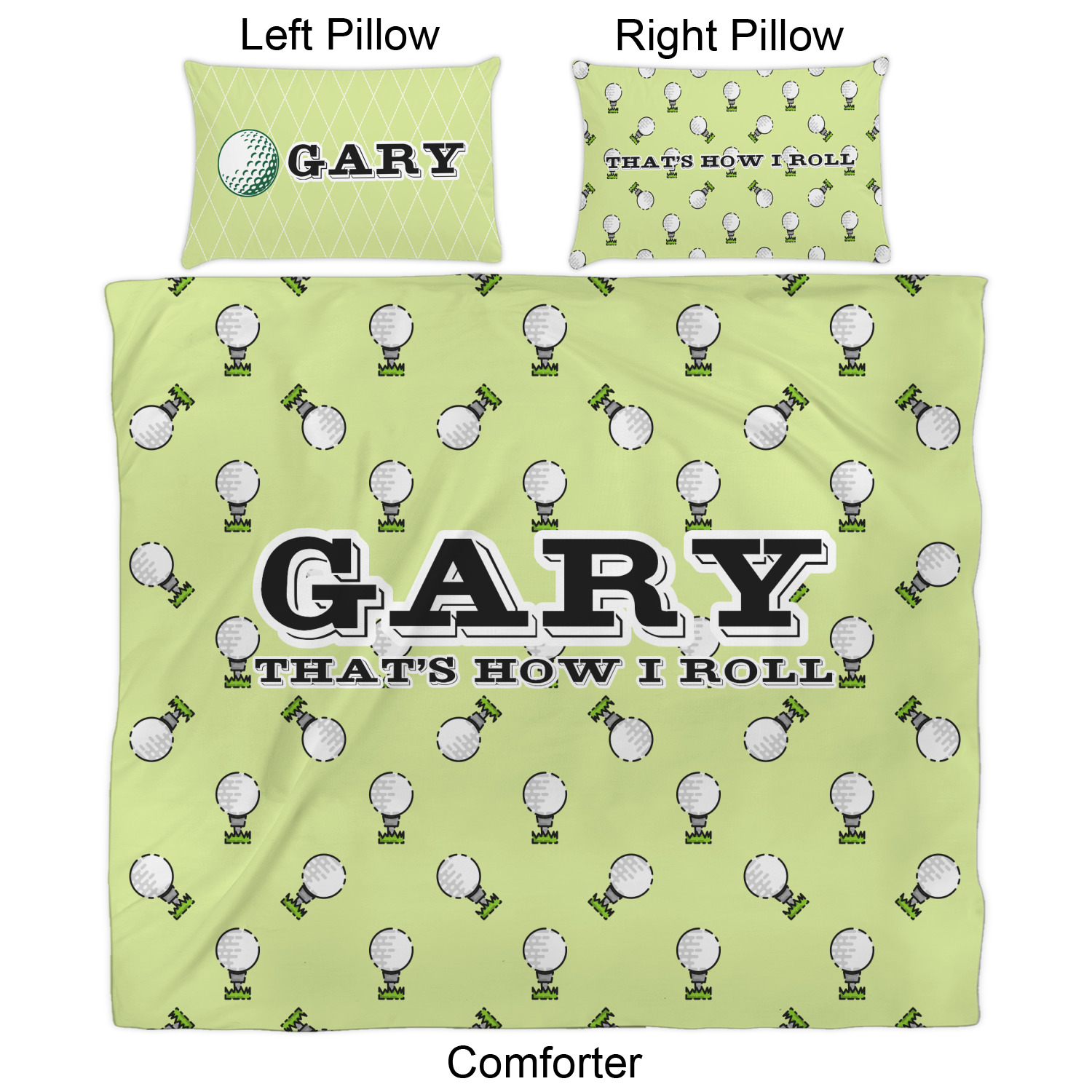 This design has a fun background that has illustrations of golf balls on a tee symmetrically placed to make a fun pattern. The main colors are a light lime green with a little dark green and white. The text is easily changed to whatever you like. The default has a place for a name as well as the phrase "that's how I roll" to get a good laugh out of your buddies. This is a fun design to use on your golfing gear.