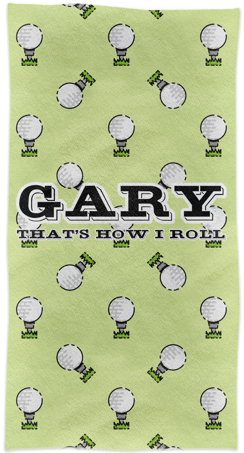 This design has a fun background that has illustrations of golf balls on a tee symmetrically placed to make a fun pattern. The main colors are a light lime green with a little dark green and white. The text is easily changed to whatever you like. The default has a place for a name as well as the phrase "that's how I roll" to get a good laugh out of your buddies. This is a fun design to use on your golfing gear.