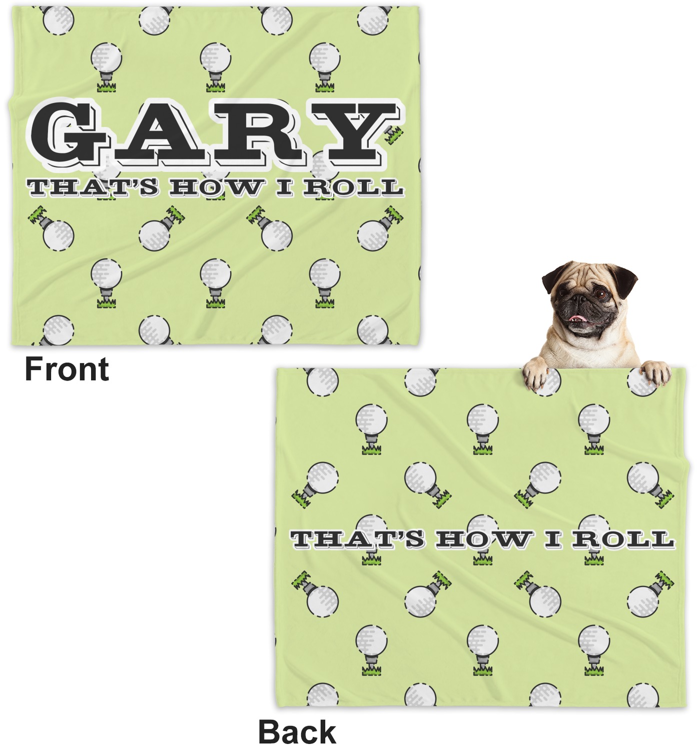 This design has a fun background that has illustrations of golf balls on a tee symmetrically placed to make a fun pattern. The main colors are a light lime green with a little dark green and white. The text is easily changed to whatever you like. The default has a place for a name as well as the phrase "that's how I roll" to get a good laugh out of your buddies. This is a fun design to use on your golfing gear.