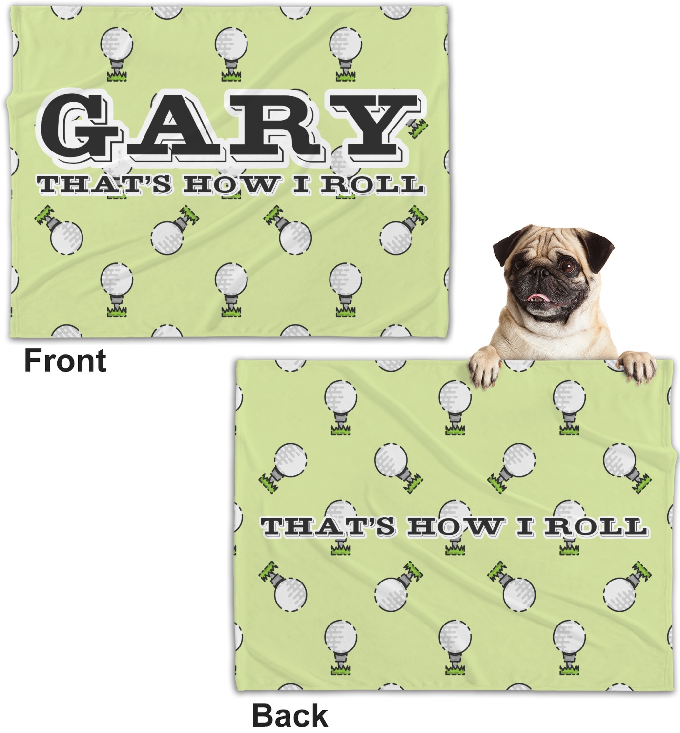 This design has a fun background that has illustrations of golf balls on a tee symmetrically placed to make a fun pattern. The main colors are a light lime green with a little dark green and white. The text is easily changed to whatever you like. The default has a place for a name as well as the phrase "that's how I roll" to get a good laugh out of your buddies. This is a fun design to use on your golfing gear.