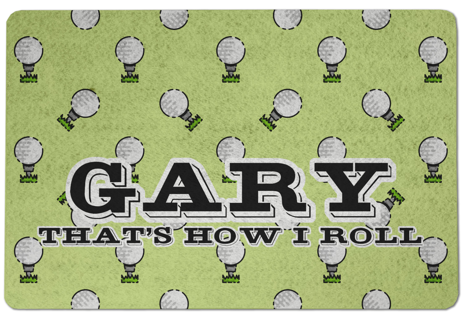 This design has a fun background that has illustrations of golf balls on a tee symmetrically placed to make a fun pattern. The main colors are a light lime green with a little dark green and white. The text is easily changed to whatever you like. The default has a place for a name as well as the phrase "that's how I roll" to get a good laugh out of your buddies. This is a fun design to use on your golfing gear.