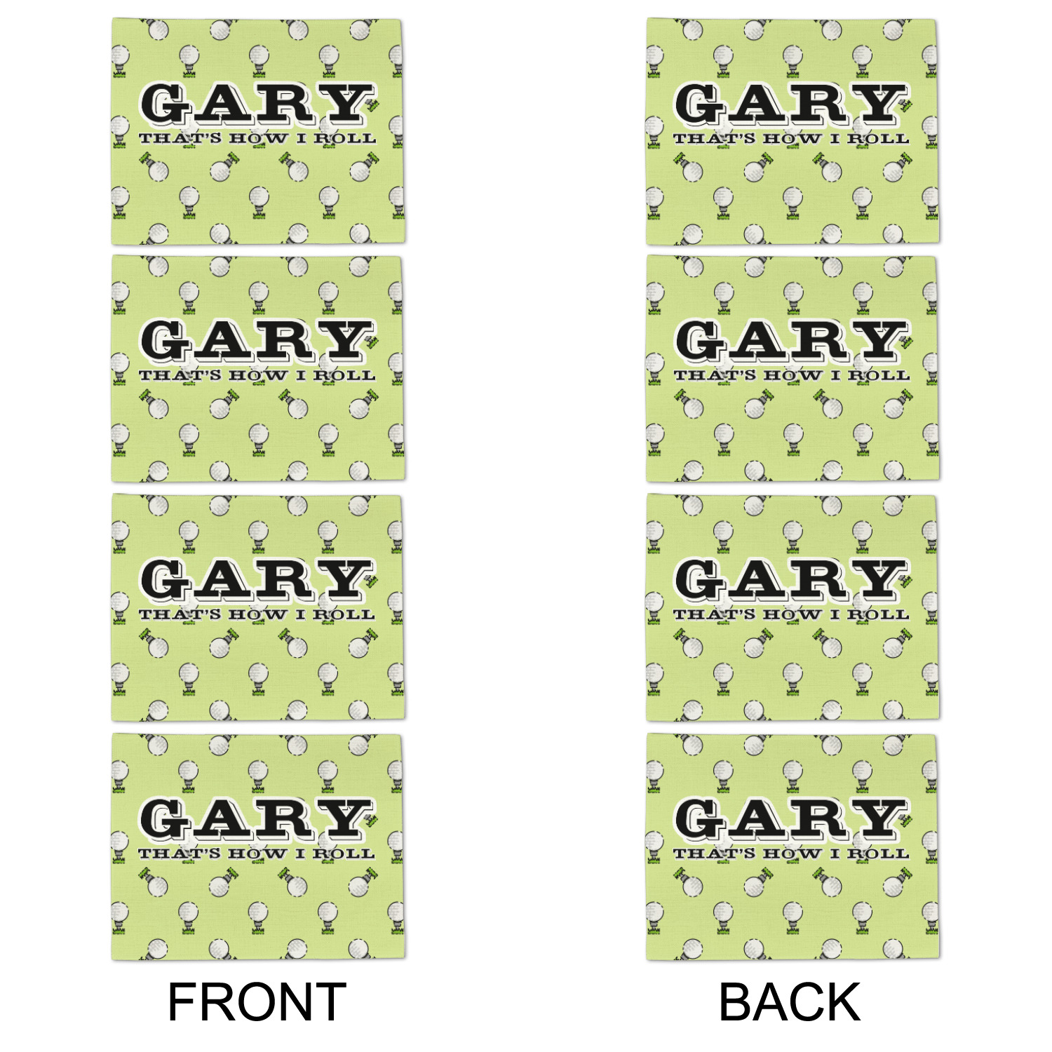 This design has a fun background that has illustrations of golf balls on a tee symmetrically placed to make a fun pattern. The main colors are a light lime green with a little dark green and white. The text is easily changed to whatever you like. The default has a place for a name as well as the phrase "that's how I roll" to get a good laugh out of your buddies. This is a fun design to use on your golfing gear.