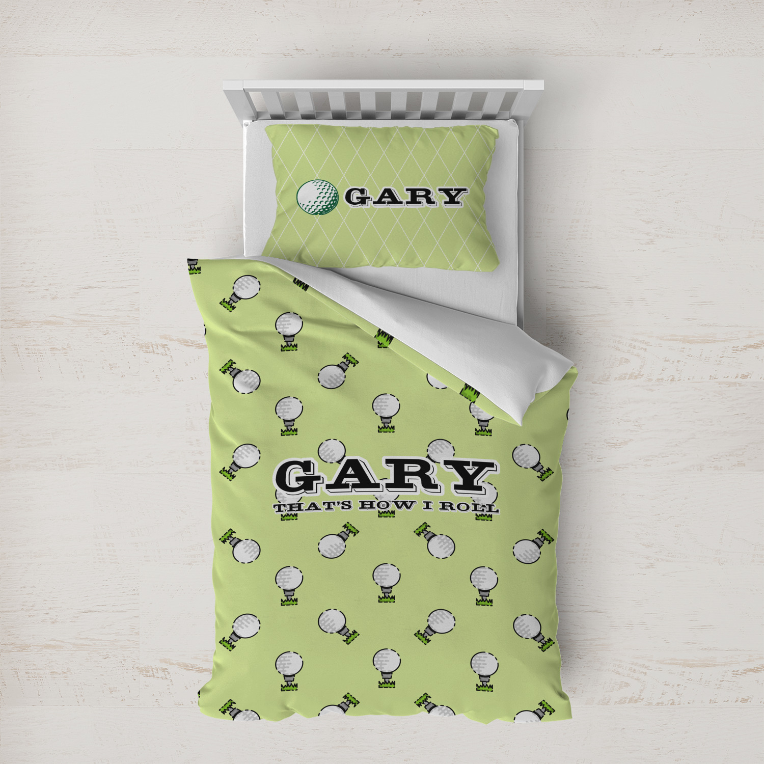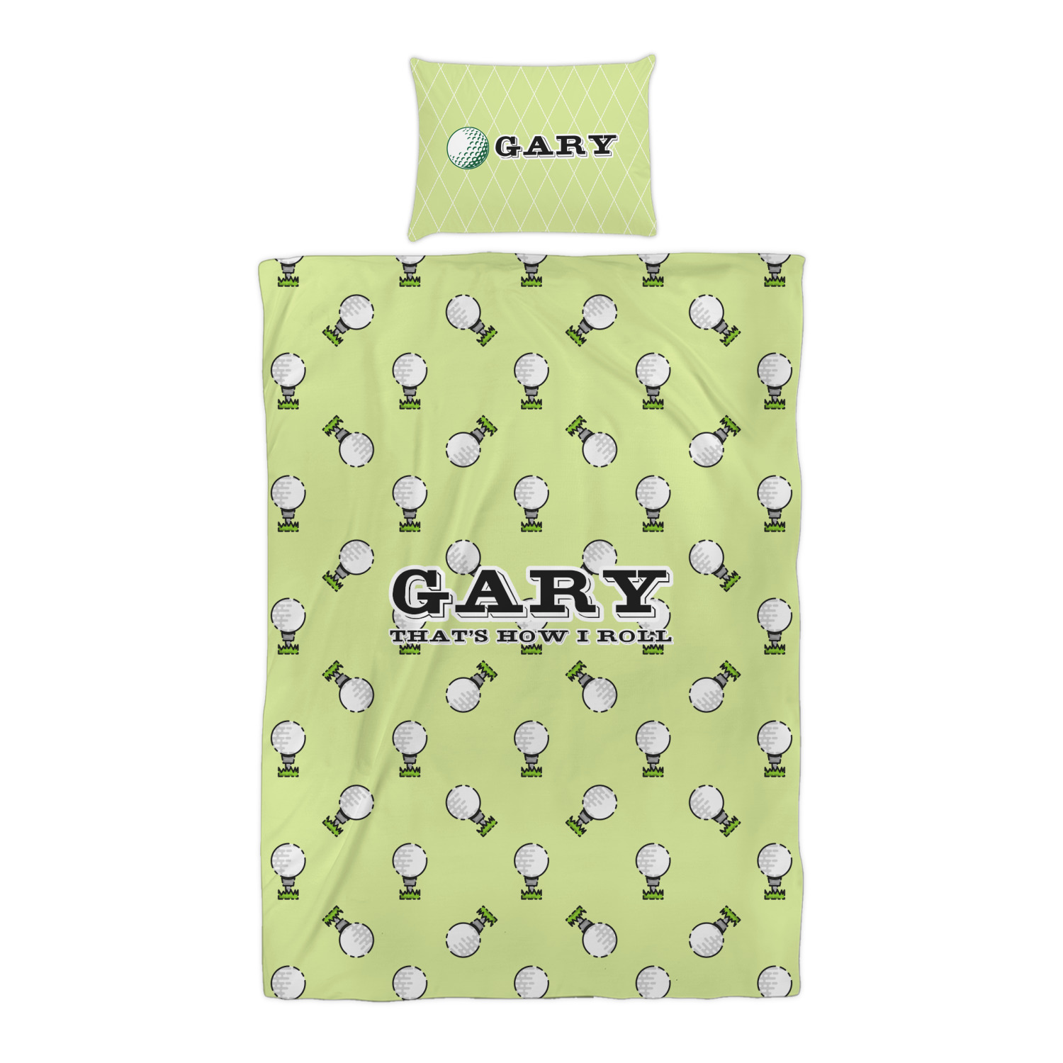 This design has a fun background that has illustrations of golf balls on a tee symmetrically placed to make a fun pattern. The main colors are a light lime green with a little dark green and white. The text is easily changed to whatever you like. The default has a place for a name as well as the phrase "that's how I roll" to get a good laugh out of your buddies. This is a fun design to use on your golfing gear.