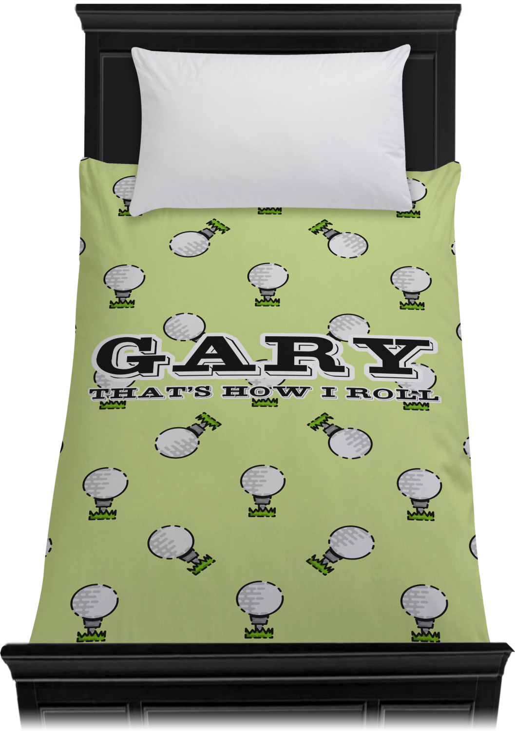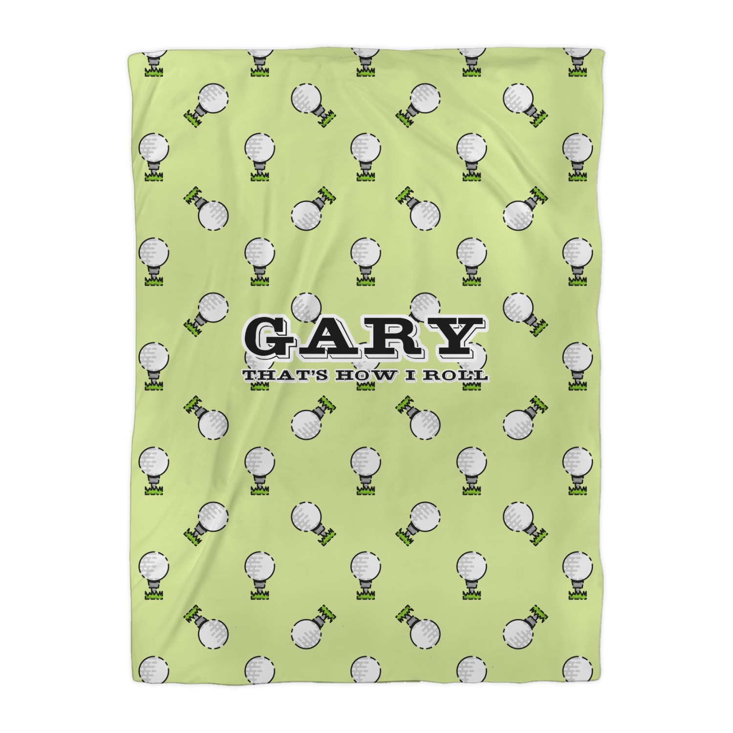 This design has a fun background that has illustrations of golf balls on a tee symmetrically placed to make a fun pattern. The main colors are a light lime green with a little dark green and white. The text is easily changed to whatever you like. The default has a place for a name as well as the phrase "that's how I roll" to get a good laugh out of your buddies. This is a fun design to use on your golfing gear.