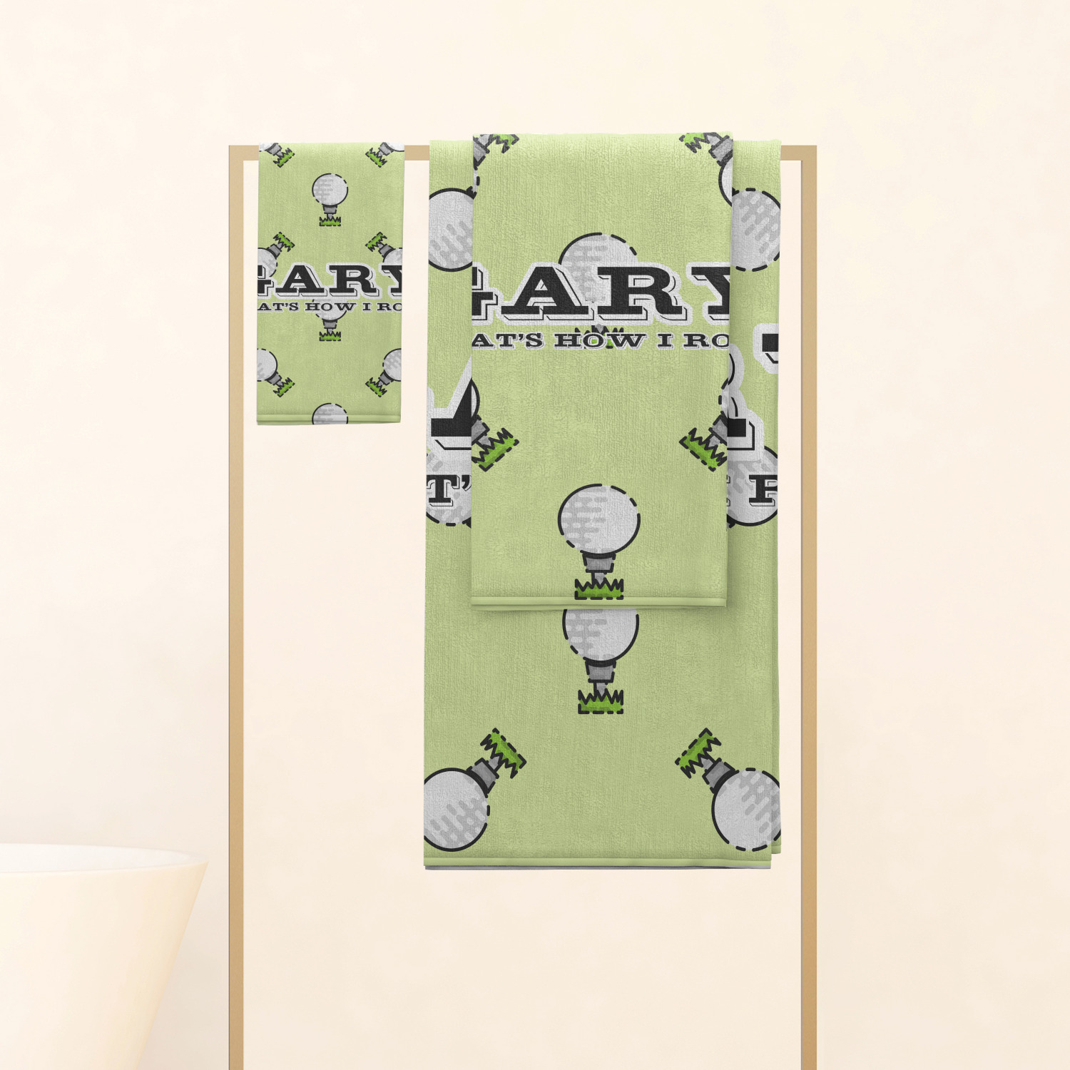 This design has a fun background that has illustrations of golf balls on a tee symmetrically placed to make a fun pattern. The main colors are a light lime green with a little dark green and white. The text is easily changed to whatever you like. The default has a place for a name as well as the phrase "that's how I roll" to get a good laugh out of your buddies. This is a fun design to use on your golfing gear.