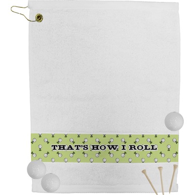 This design has a fun background that has illustrations of golf balls on a tee symmetrically placed to make a fun pattern. The main colors are a light lime green with a little dark green and white. The text is easily changed to whatever you like. The default has a place for a name as well as the phrase "that's how I roll" to get a good laugh out of your buddies. This is a fun design to use on your golfing gear.