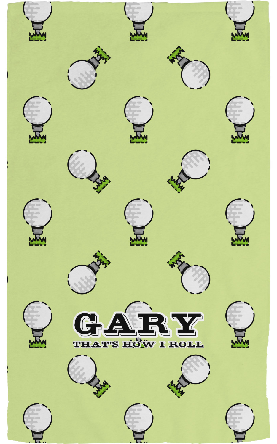 This design has a fun background that has illustrations of golf balls on a tee symmetrically placed to make a fun pattern. The main colors are a light lime green with a little dark green and white. The text is easily changed to whatever you like. The default has a place for a name as well as the phrase "that's how I roll" to get a good laugh out of your buddies. This is a fun design to use on your golfing gear.