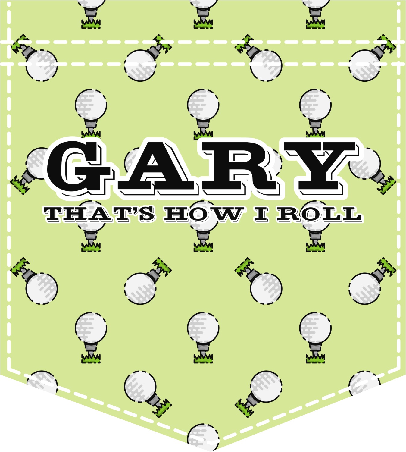 This design has a fun background that has illustrations of golf balls on a tee symmetrically placed to make a fun pattern. The main colors are a light lime green with a little dark green and white. The text is easily changed to whatever you like. The default has a place for a name as well as the phrase "that's how I roll" to get a good laugh out of your buddies. This is a fun design to use on your golfing gear.
