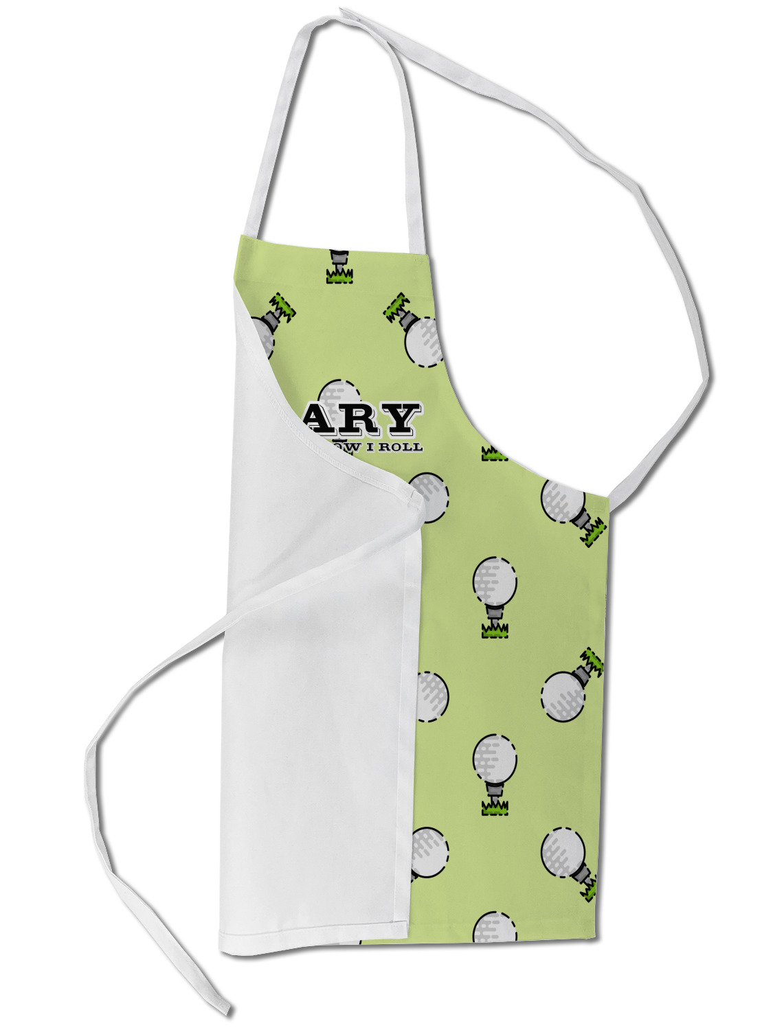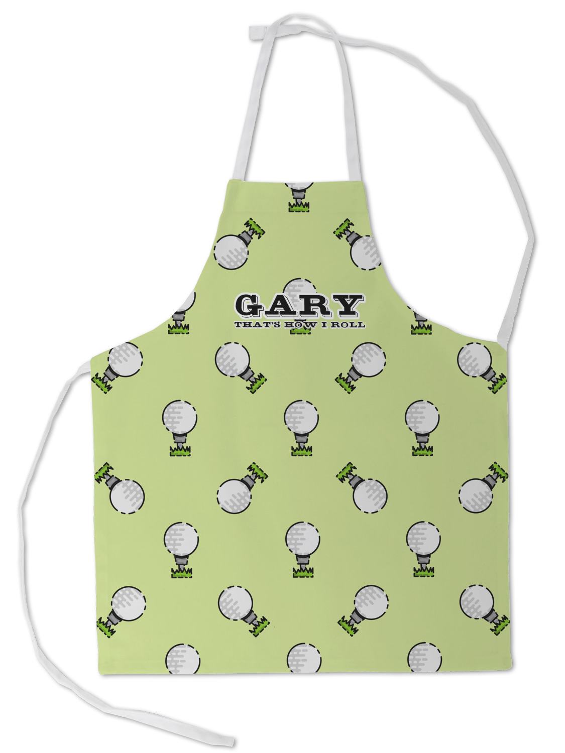 This design has a fun background that has illustrations of golf balls on a tee symmetrically placed to make a fun pattern. The main colors are a light lime green with a little dark green and white. The text is easily changed to whatever you like. The default has a place for a name as well as the phrase "that's how I roll" to get a good laugh out of your buddies. This is a fun design to use on your golfing gear.