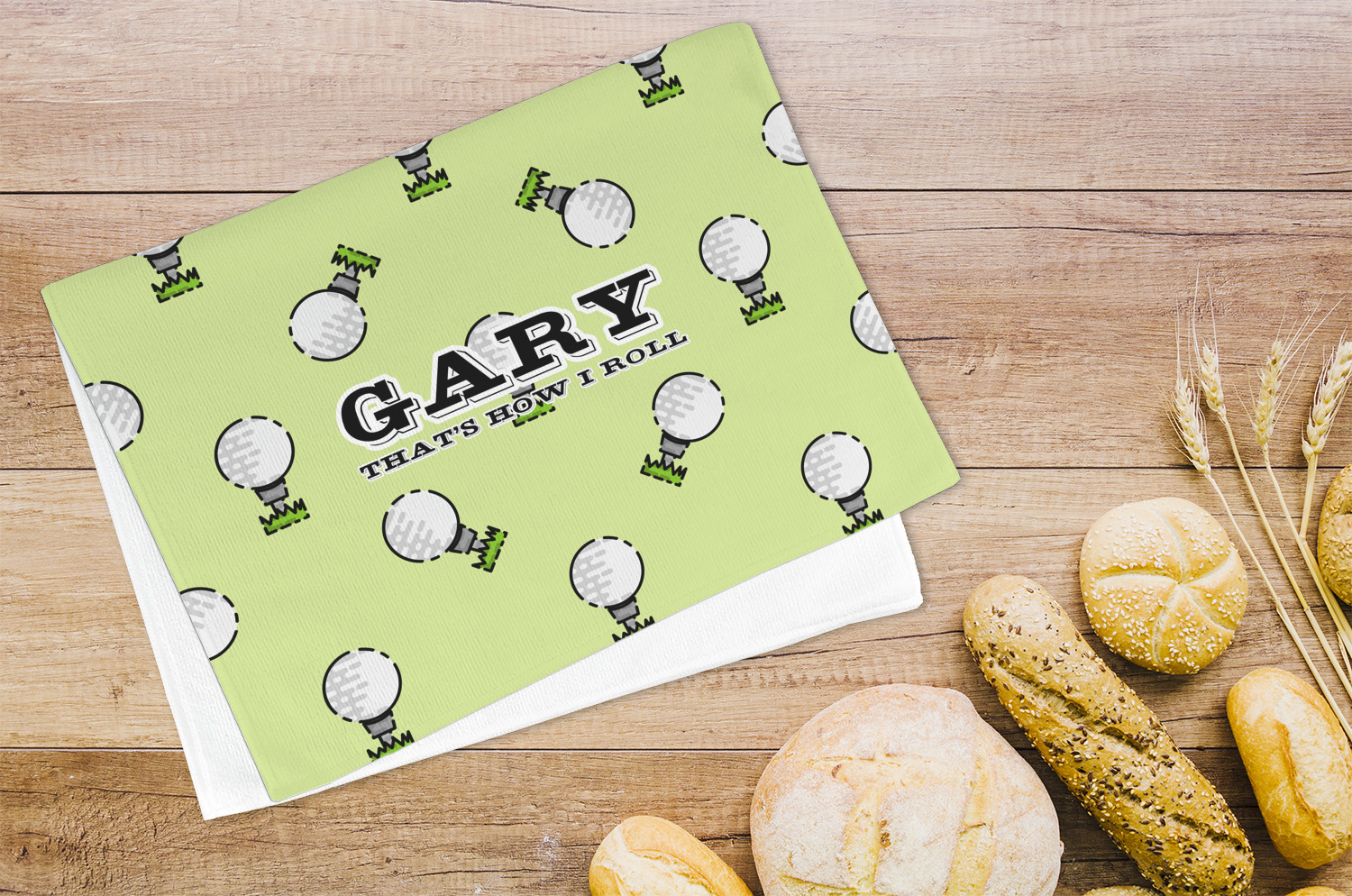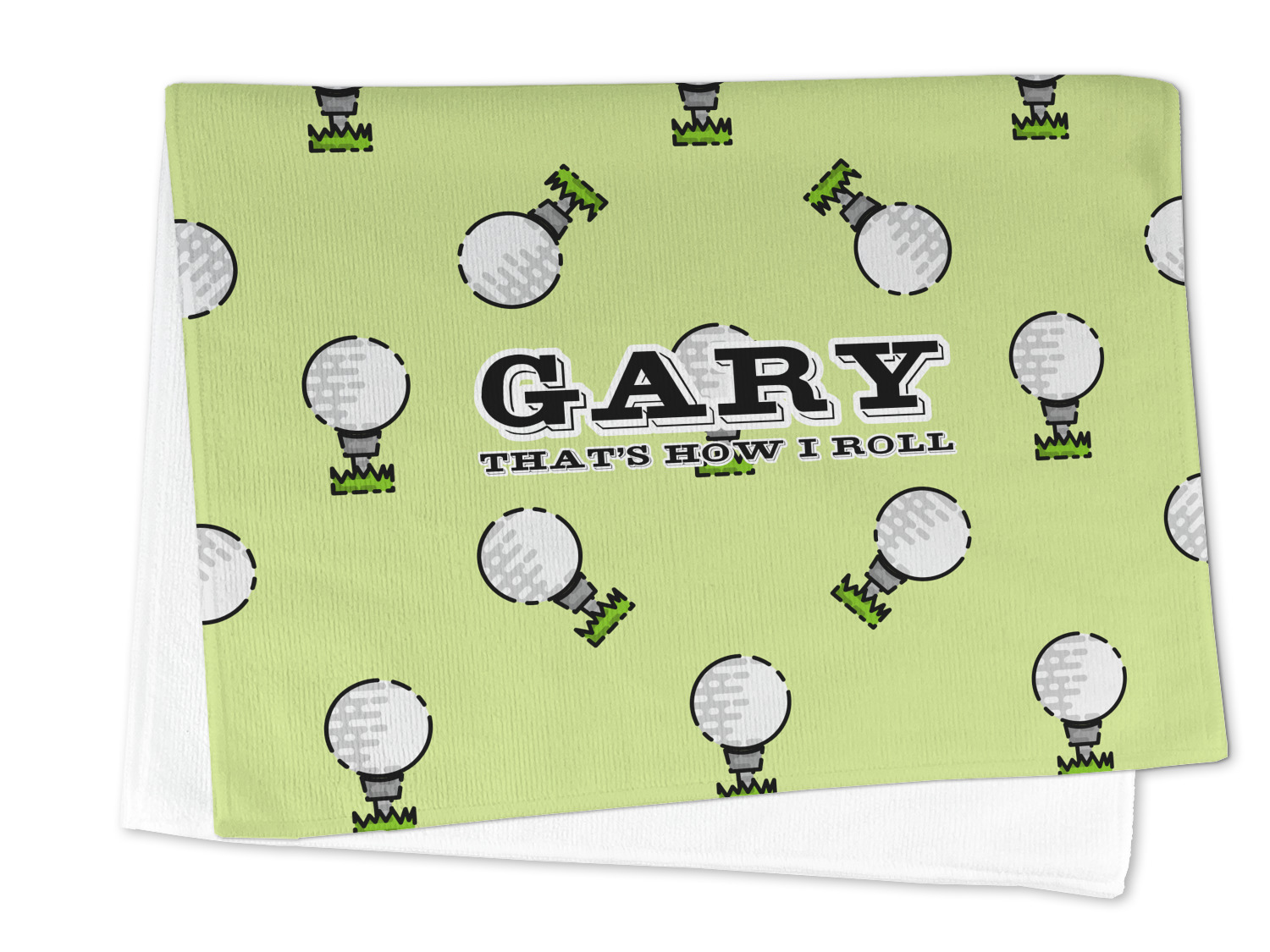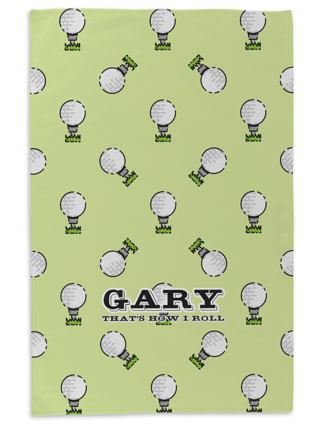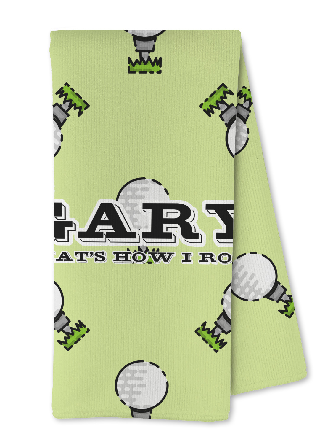 This design has a fun background that has illustrations of golf balls on a tee symmetrically placed to make a fun pattern. The main colors are a light lime green with a little dark green and white. The text is easily changed to whatever you like. The default has a place for a name as well as the phrase "that's how I roll" to get a good laugh out of your buddies. This is a fun design to use on your golfing gear.
