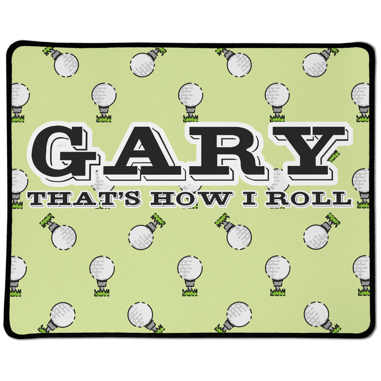 This design has a fun background that has illustrations of golf balls on a tee symmetrically placed to make a fun pattern. The main colors are a light lime green with a little dark green and white. The text is easily changed to whatever you like. The default has a place for a name as well as the phrase "that's how I roll" to get a good laugh out of your buddies. This is a fun design to use on your golfing gear.