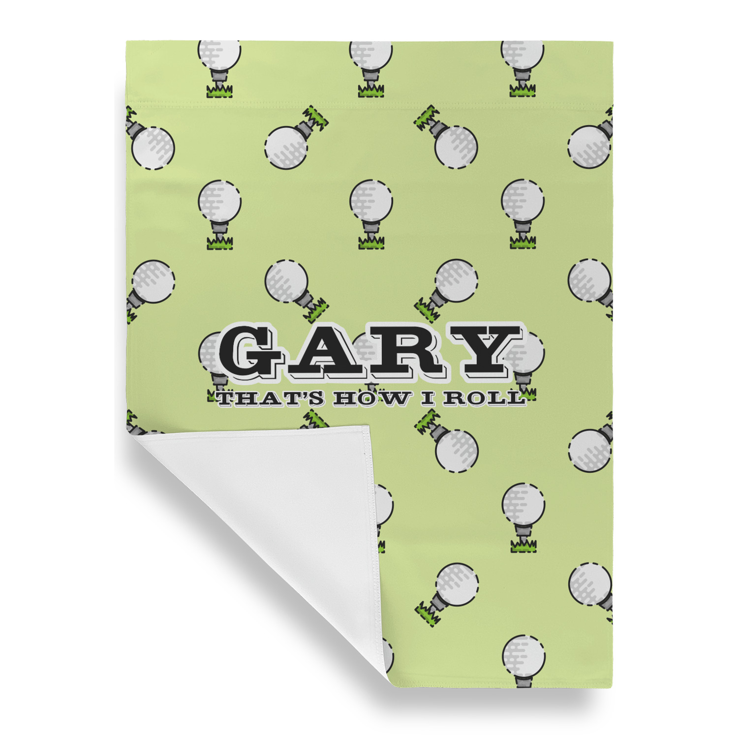 This design has a fun background that has illustrations of golf balls on a tee symmetrically placed to make a fun pattern. The main colors are a light lime green with a little dark green and white. The text is easily changed to whatever you like. The default has a place for a name as well as the phrase "that's how I roll" to get a good laugh out of your buddies. This is a fun design to use on your golfing gear.